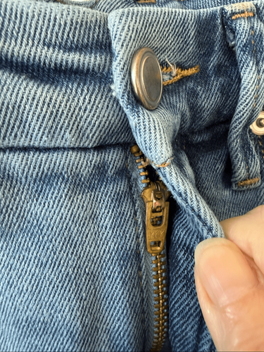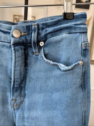 Good American high-rise straight leg jeans with button and zip closure. Traditional five pocket styling. Cotton and elastin blend. Laying flat measures 11 inches straight across the waist with an 11 inch rise and a 28.5 inch inseam. Retail for $158.