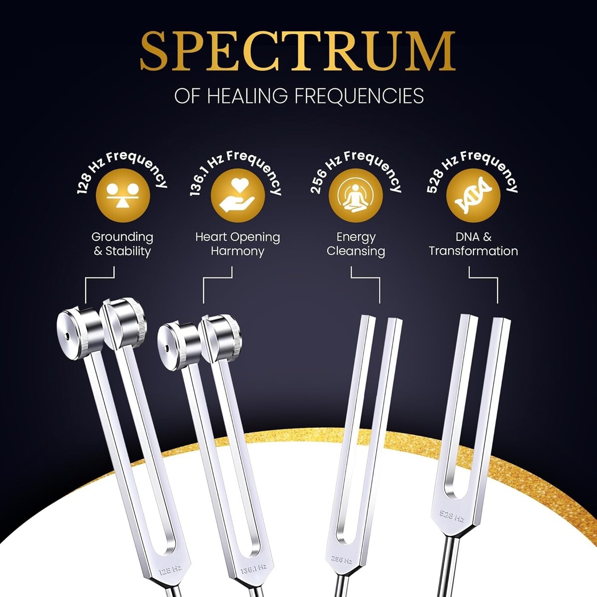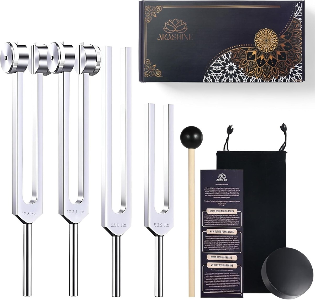 Tuning forks for healing and meditation: This professional tuning forks for healing set includes four precise frequencies ? 128Hz, 136.1Hz, 256Hz, and 528Hz ? carefully calibrated to enhance holistic well-being, chakra healing, sound therapy, and meditation. Each fork supports emotional harmony, physical relaxation, and energy balance, making it perfect for vibrational therapy, yoga, and stress relief.