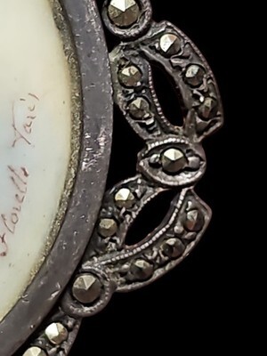 Antique Hand Painted Portrait Brooch Silver Marcasite Signed Miniature