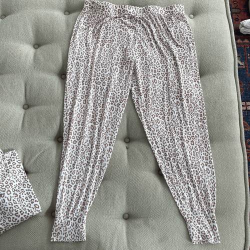 Nordstrom women?s long pajama sets including a long sleeve, V-neck top and Jogger style pants in 95% modal 5% spandex blend. Animal print in a mocha and pink color way. Laying flat measures 17 inches straight across the elastic waist stretching to 20 without much resistance. 11.5 inch rise and 30 inch inseam. The V-neck top measures 27 inches shoulder to hem and 25 inches armpit to armpit. Washed and worn maybe once because they do not fit me.