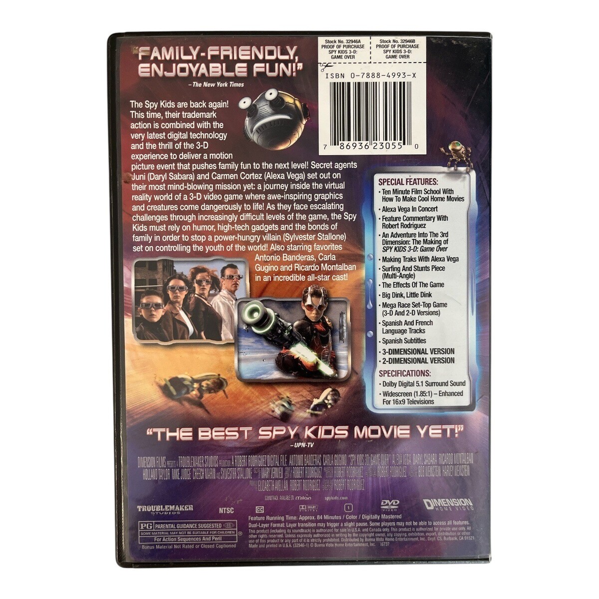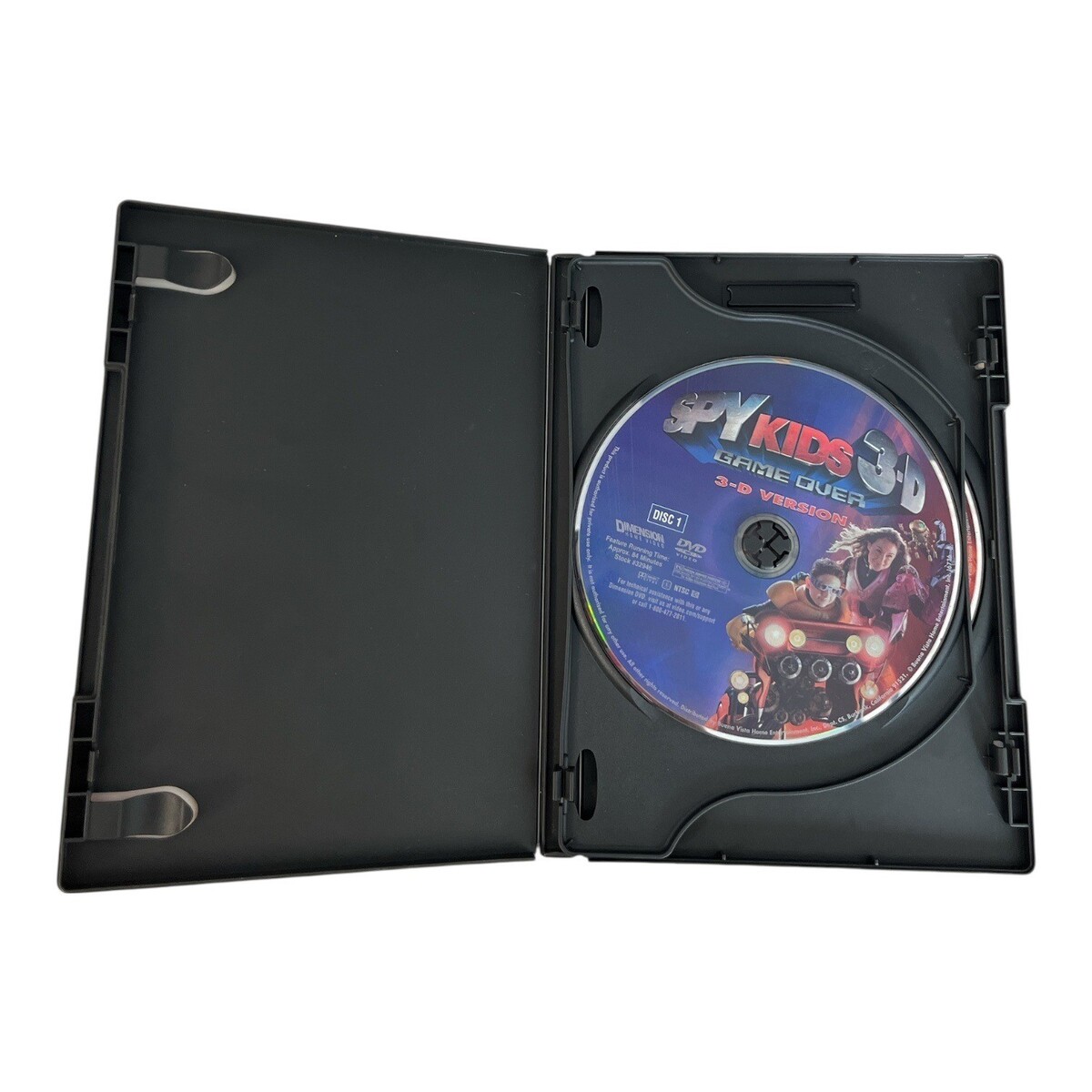 Original DVD release of Spy Kids 3-D Game Over, the third installment in the Spy Kids franchise. This Collector?s Series edition includes both the 3-D and 2-D versions of the film along with bonus features. Family-friendly action adventure blending live action and digital effects, released during the early 2000s peak of 3-D home media. Includes original case and disc.