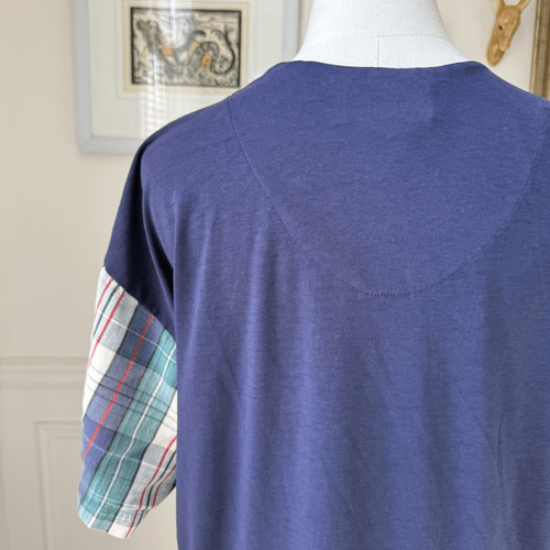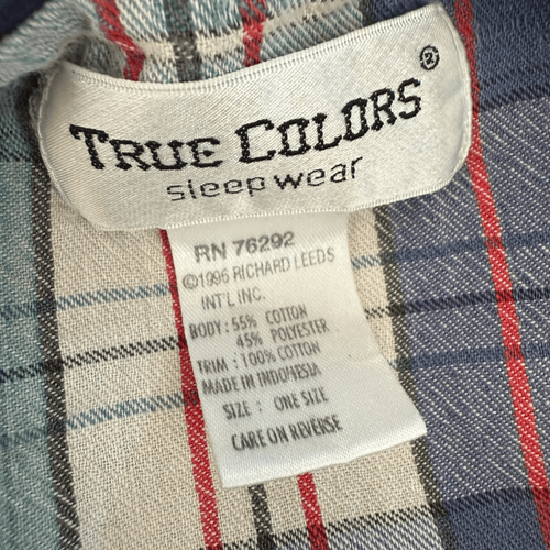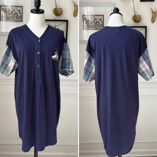 Vintage true colors sleepwear sleep shirt. Designed to look like a varsity jersey, but made out of a soft cotton and polyester blend, this sleep, shirt buttons, halfway down the front with a V-neck and contrast short sleeves in a coordinating plaid. There is an embroidered teddy bear at the chest that says varsity. Tag size one size fits most and featured on my size medium dress form for scale. Laying flat measures 21 inches armpit to armpit and 35 inches shoulder to hem