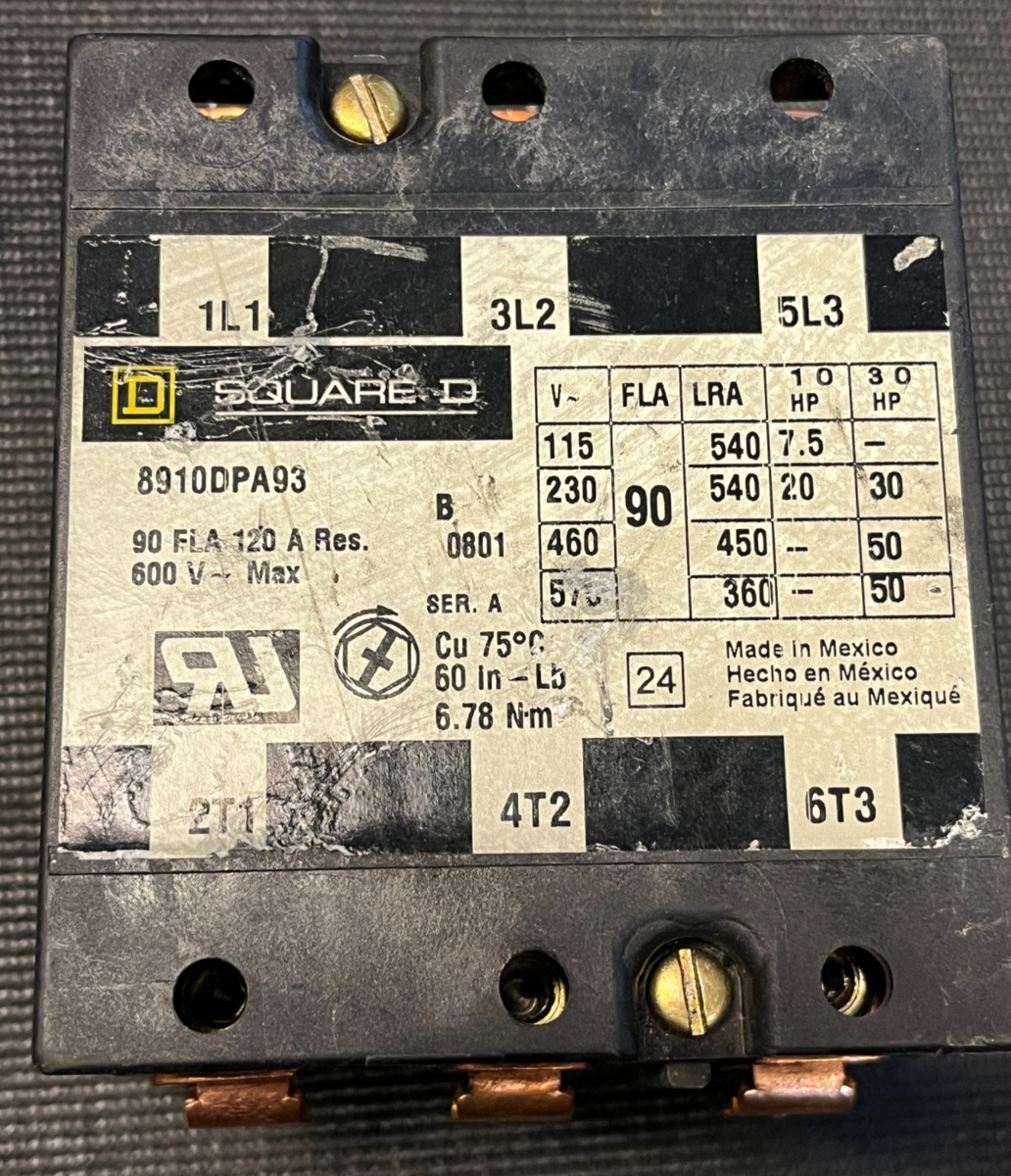 Used, untested Square D 8910DPA93 definite?purpose contactor rated 90 A FLA, 120 A resistive at up to 600 V AC. This 3?pole contactor is commonly used in HVAC, refrigeration, and industrial motor?control panels to switch compressors, heaters, and other loads. It features quick?connect terminals and binder?head screws for easy wiring and is designed for panel?mount installation.