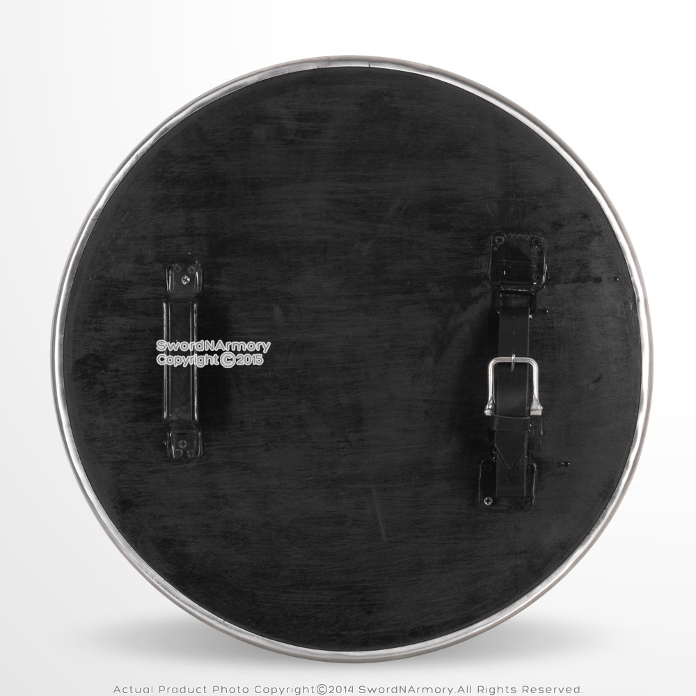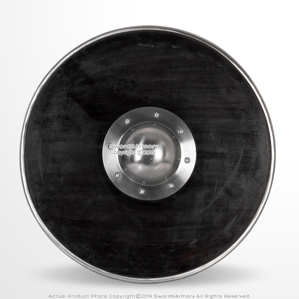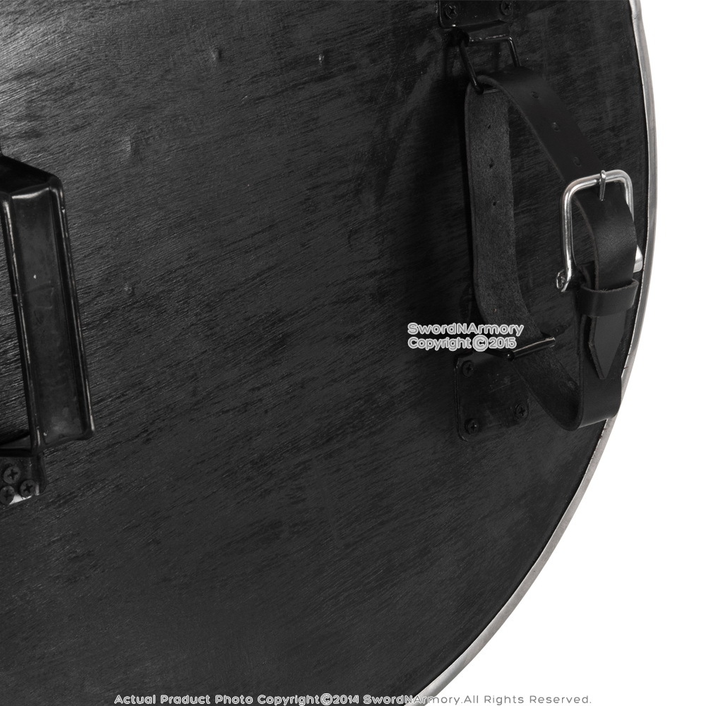 This is the 21" Black Functional Viking Norse Wooden Round Shield Steel Boss Reinforced Rim LARP Cosplay. This is a smaller diameter Viking Norse round shield. Featuring a solid wood construction with steel lined rim with steel center boss, this shield is ready for battle. The handle is made of steel and there is also an arm strap made of real leather with a steel buckle.