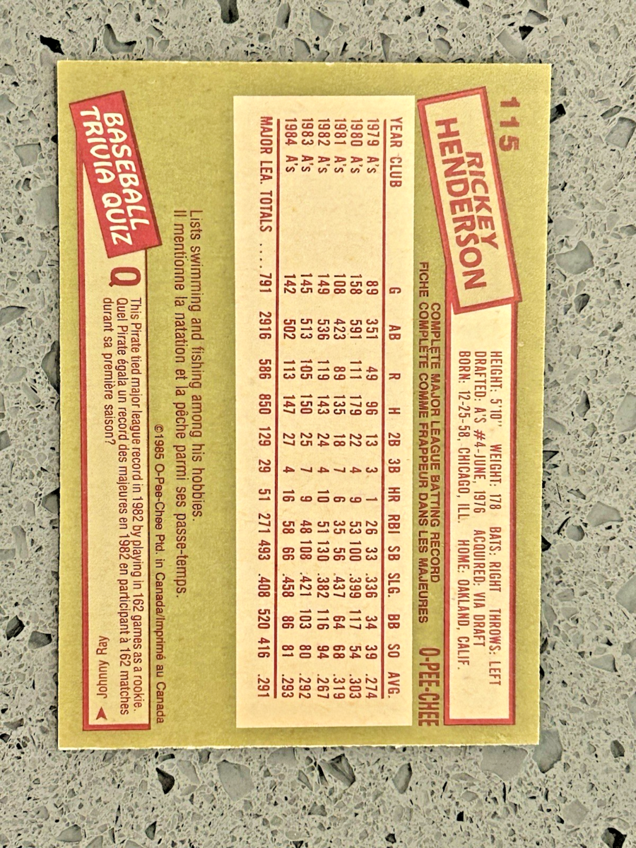 1985 O-Pee-Chee Rickey Henderson #115 1st Yankees Card - 90% Rarer Than Topps D