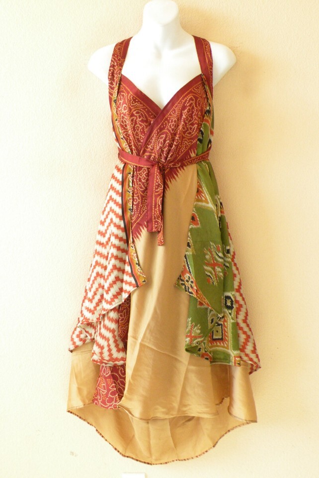 A luxurious blend of one of kind colors and prints enriched by a unique patterns. These beautiful 2 layers versatile vintage silk wraps offer an array of possibilities for over 100 ways to wear. You can achieve any number of looks from simple to sophisticated in skirt, dress, top, sarong, sari style, poncho or shawl.