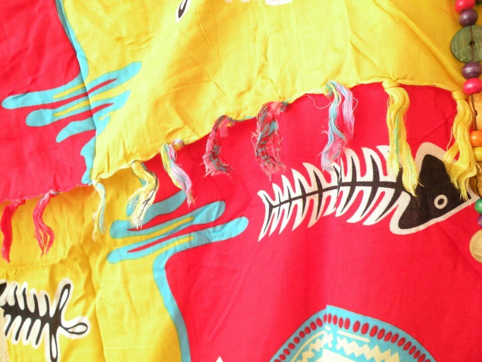 available. The hand printed motif or tie dye pattern of the fringe chest panel varies from dress to dress.