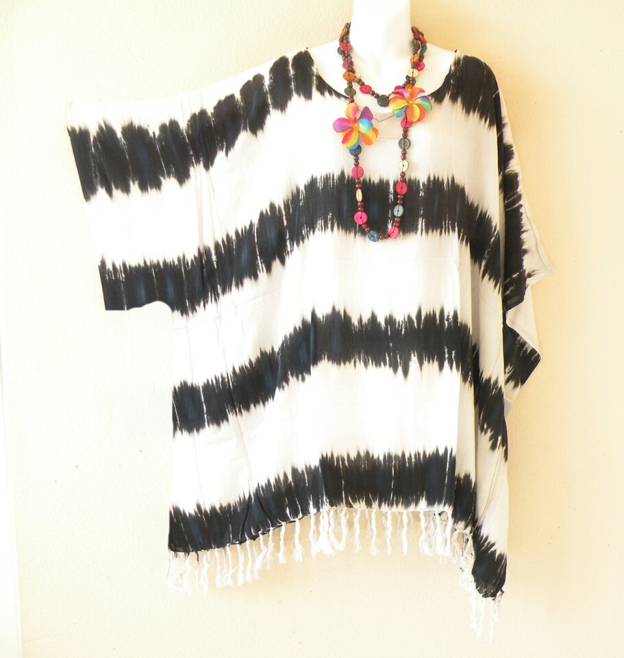 KB397 White Black Stripe Tunic Plus Kimono Poncho Hippy Women Blouse Top upto 5X