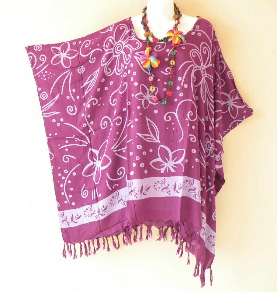 KB466 Purple Floral Batik Women Kaftan Poncho Tunic Women Blouse Top upto 5X