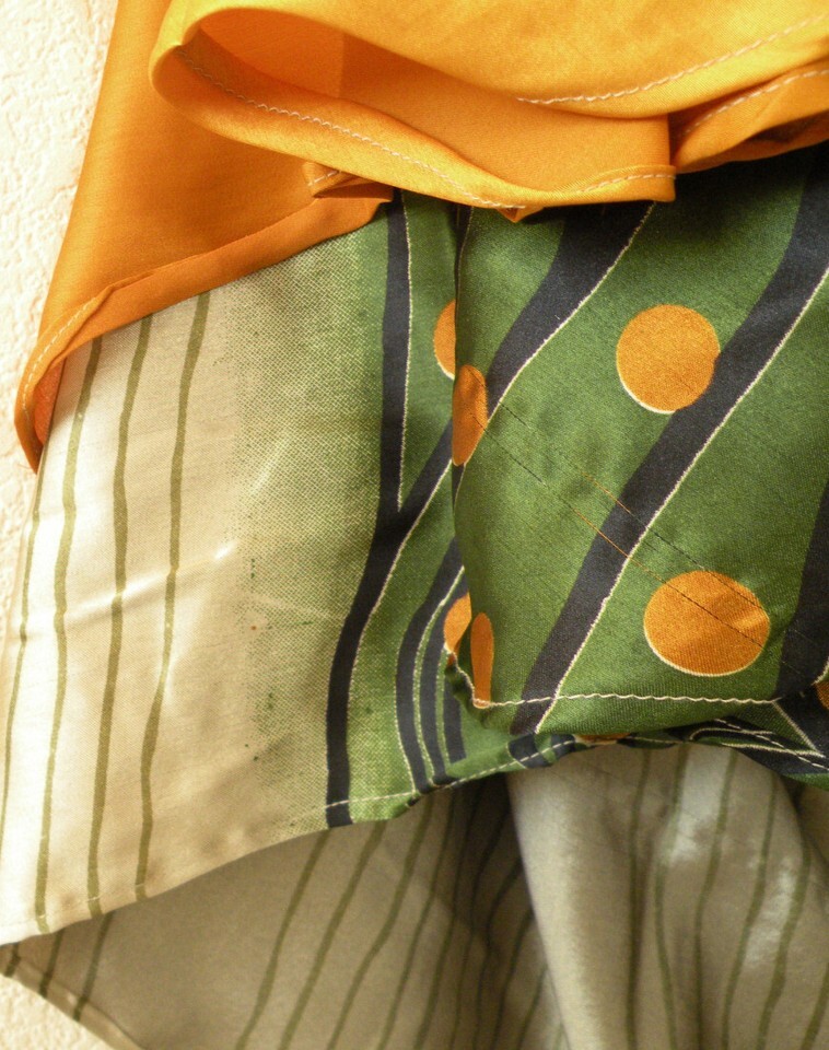 A luxurious blend of one of kind colors and prints enriched by a unique patterns. These beautiful 2 layers versatile vintage silk wraps offer an array of possibilities for over 100 ways to wear. You can achieve any number of looks from simple to sophisticated in skirt, dress, top, sarong, sari style, poncho or shawl.