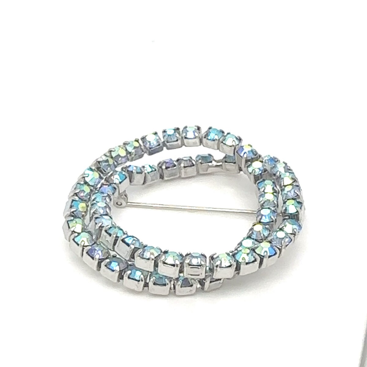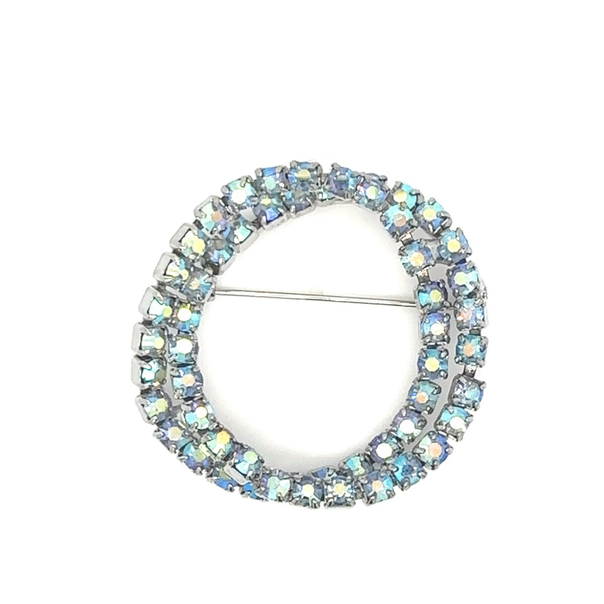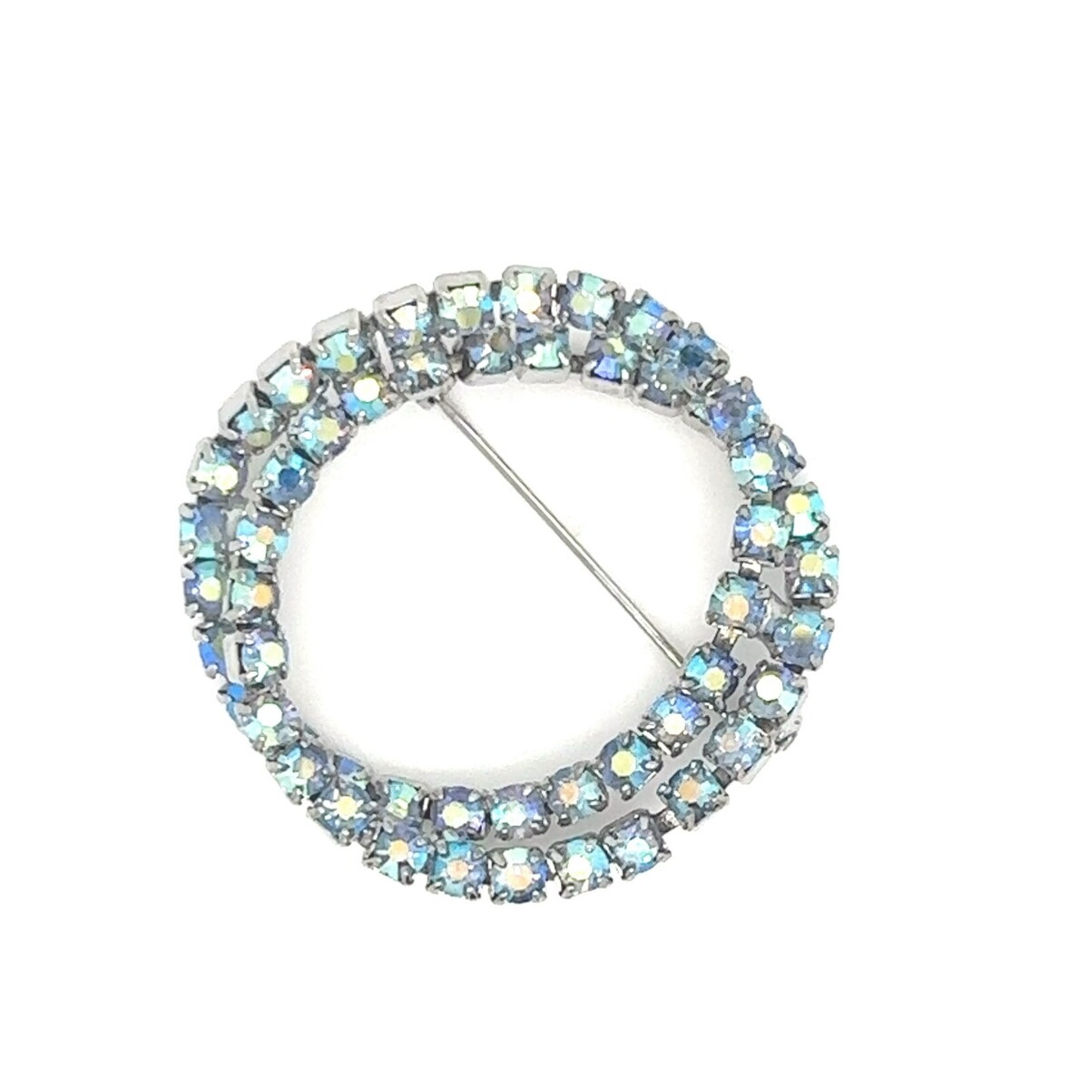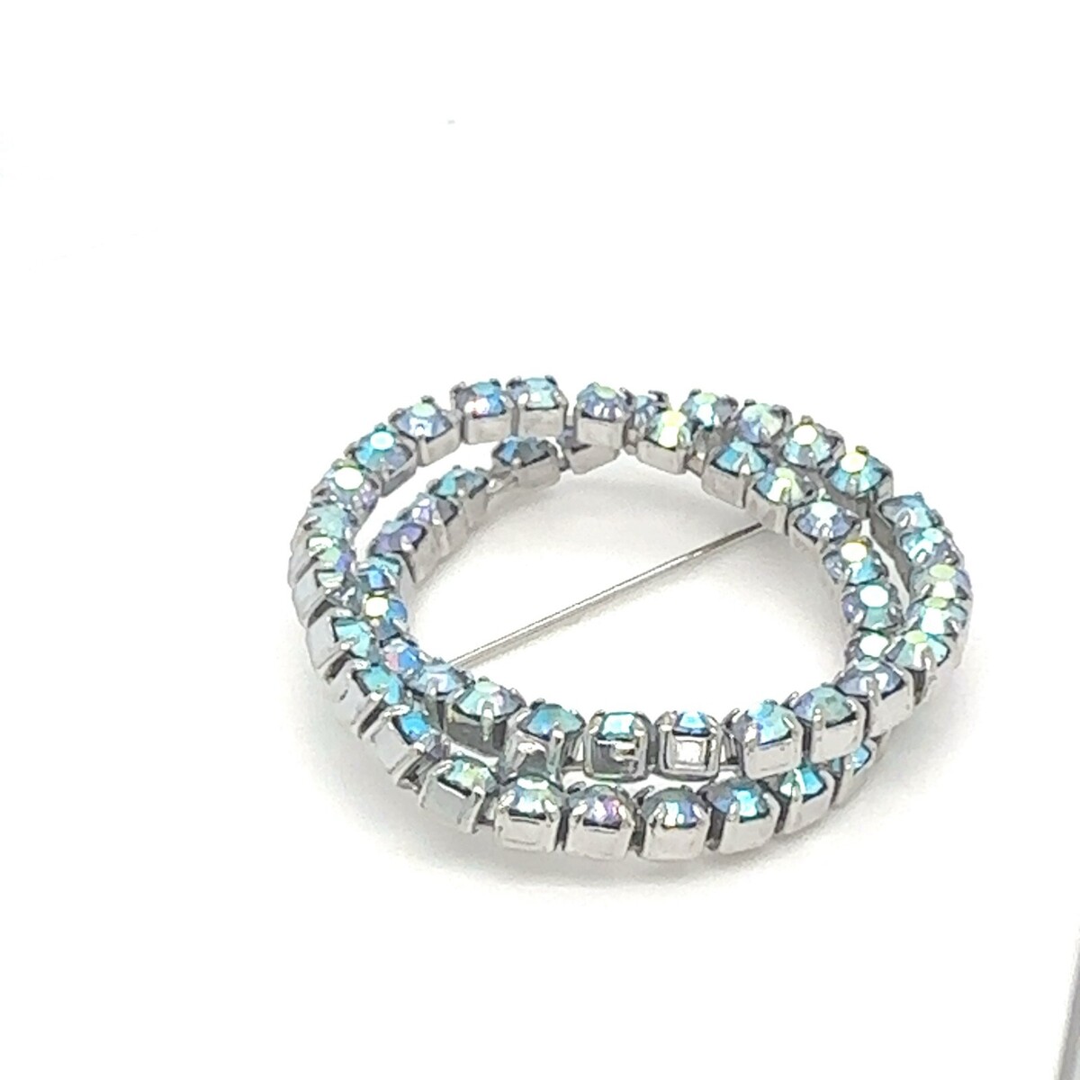 Stick pin brooch of intertwined circles of iridescent blue stones.