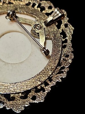 The decorative frame has an intricate raised design and a rich, aged dark gold tone that complements the artwork beautifully. This brooch has a classic vintage look and would work well styled on a jacket lapel, sweater, scarf, or displayed as part of a miniature art or jewelry collection.
