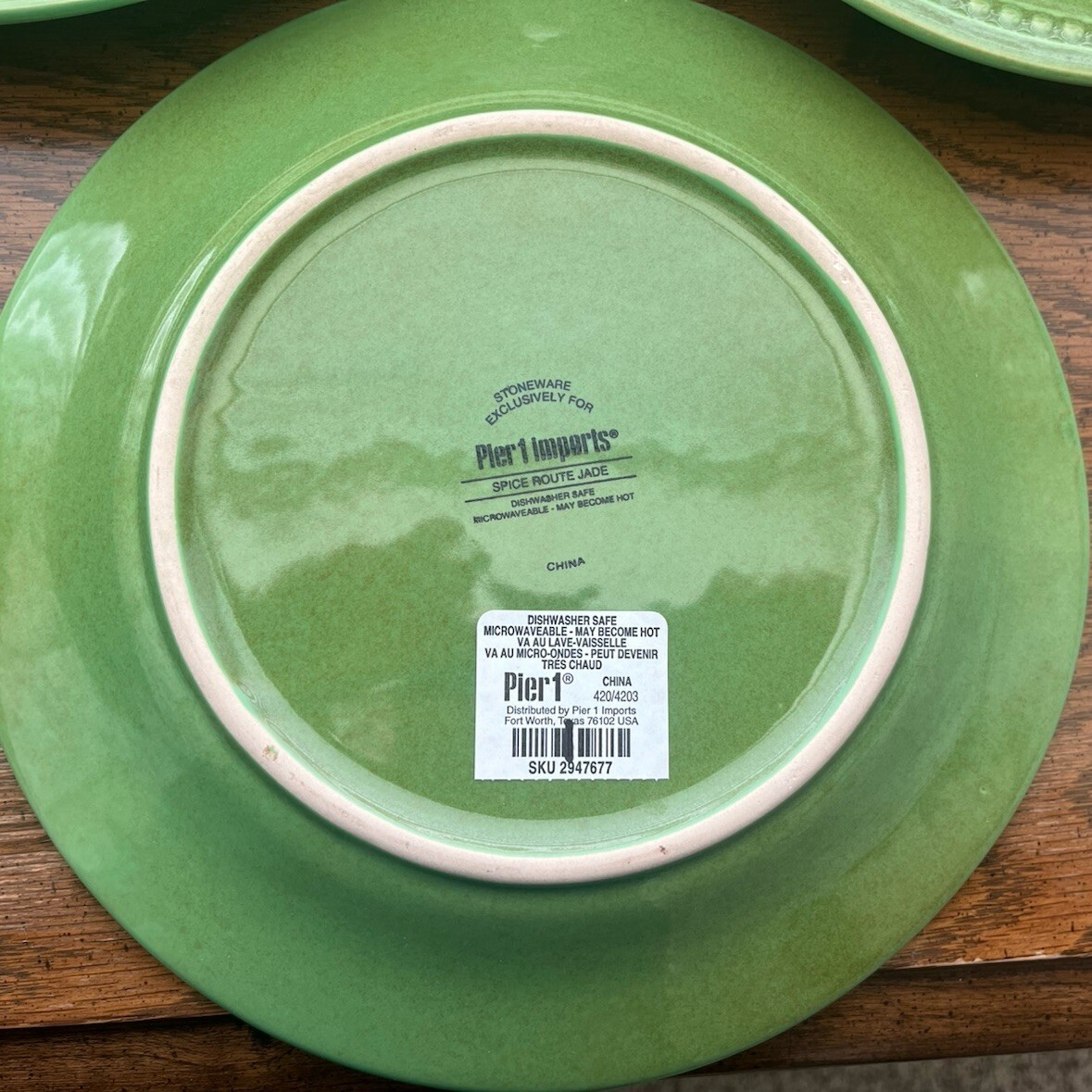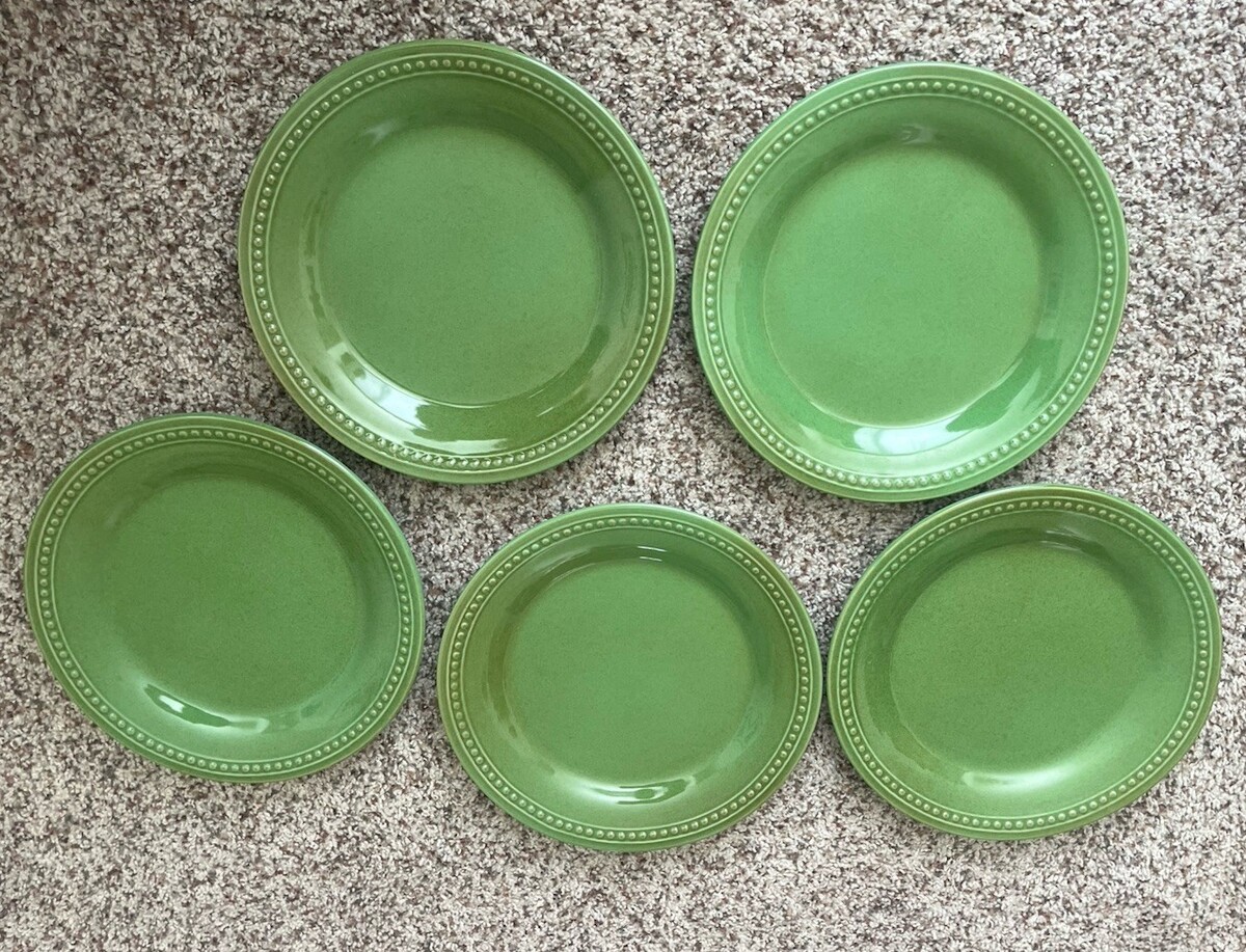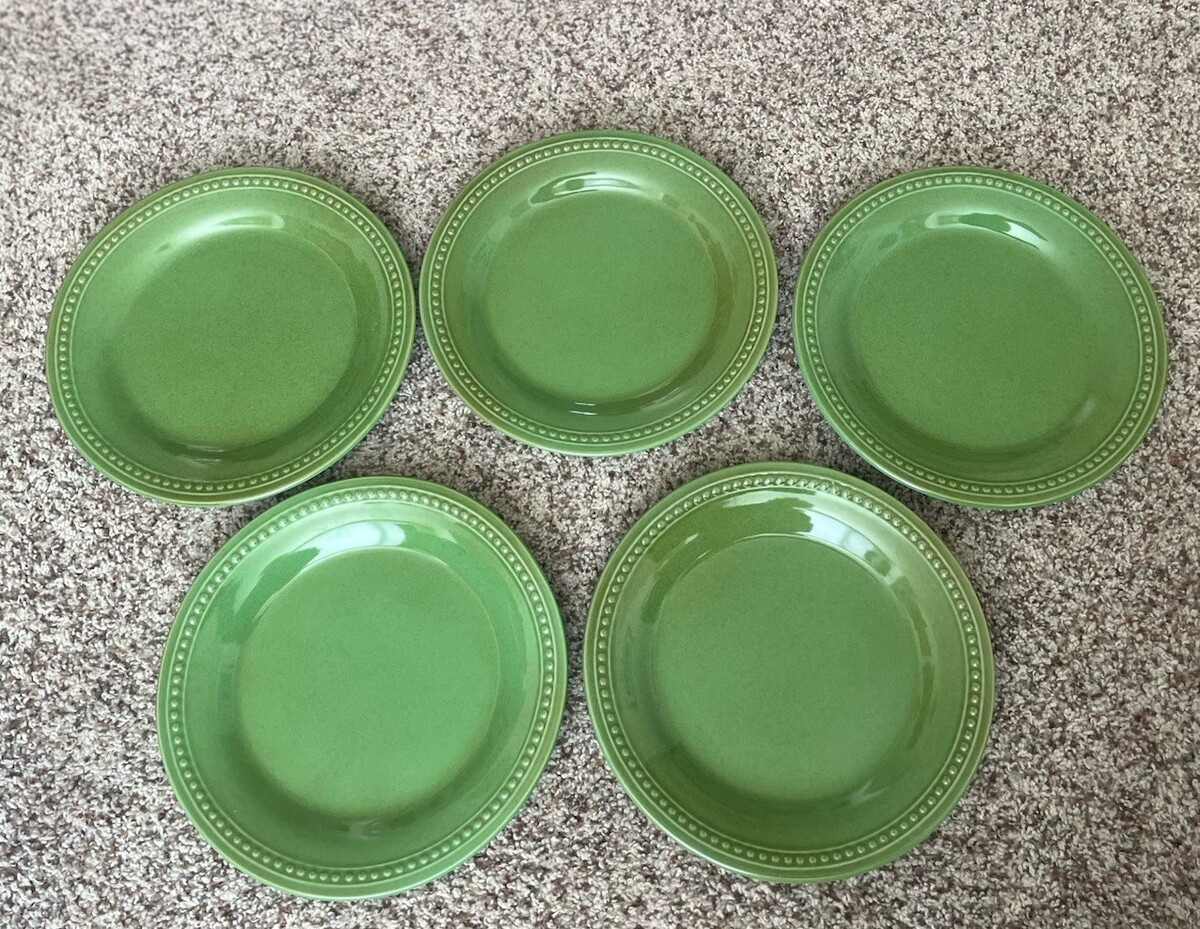 This product is a set of 5 NWT Pier 1 Spice Route Jade salad dessert plates with a beaded rim. The plates are round, solid green in color, and dishwasher safe. They feature a smooth finish and are suitable for all occasions. Ideal for serving salads or desserts, these original plates from Pier 1 Imports add a touch of elegance to any dining table. Please let me know if you have any questions!