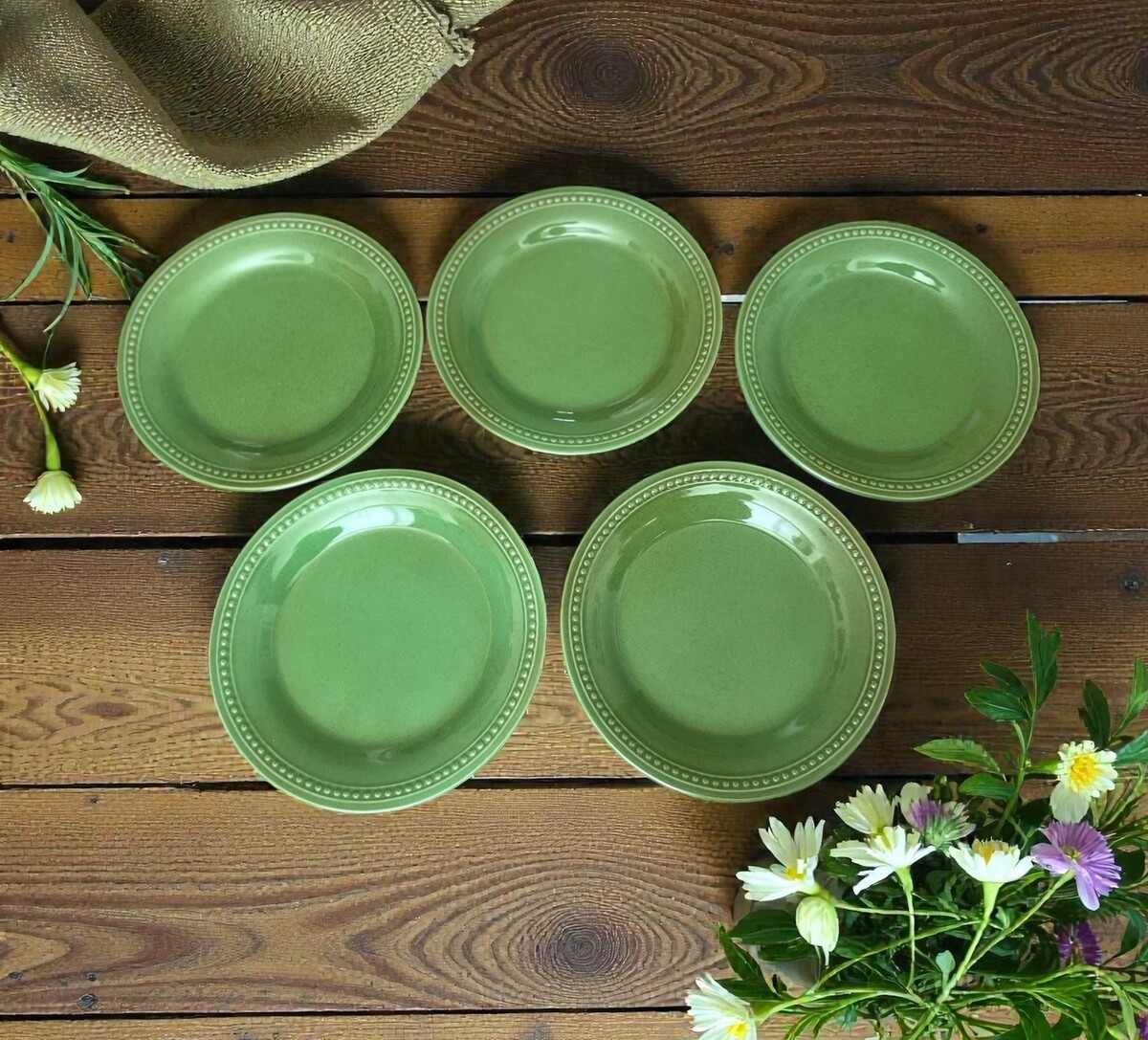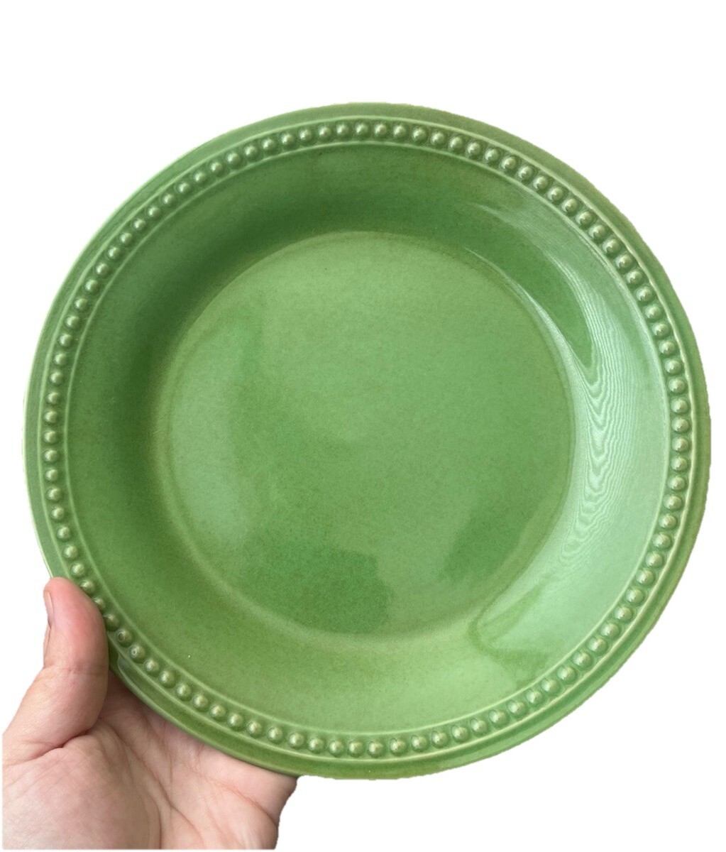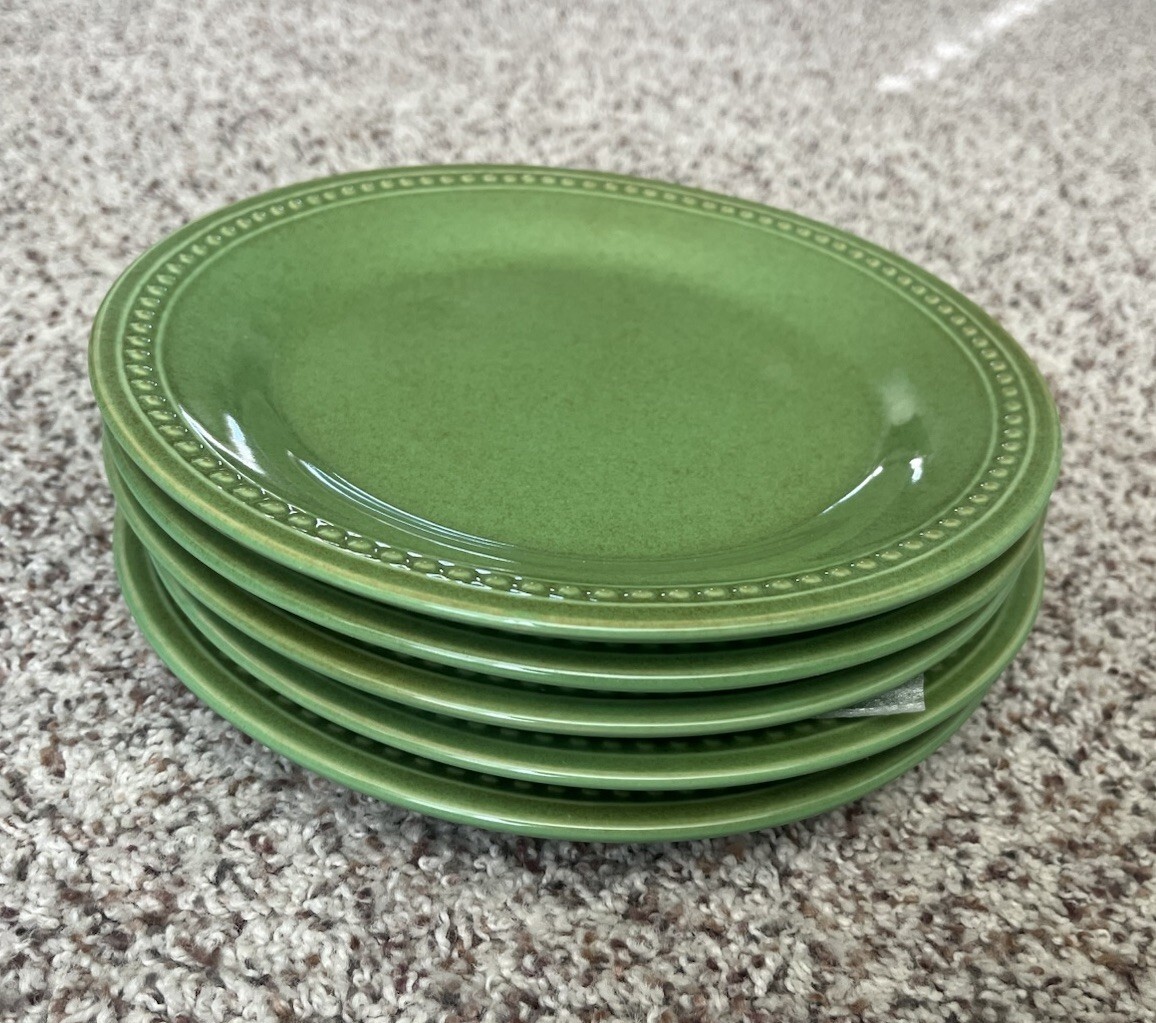 This product is a set of 5 NWT Pier 1 Spice Route Jade salad dessert plates with a beaded rim. The plates are round, solid green in color, and dishwasher safe. They feature a smooth finish and are suitable for all occasions. Ideal for serving salads or desserts, these original plates from Pier 1 Imports add a touch of elegance to any dining table. Please let me know if you have any questions!