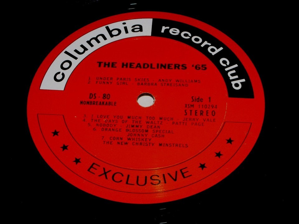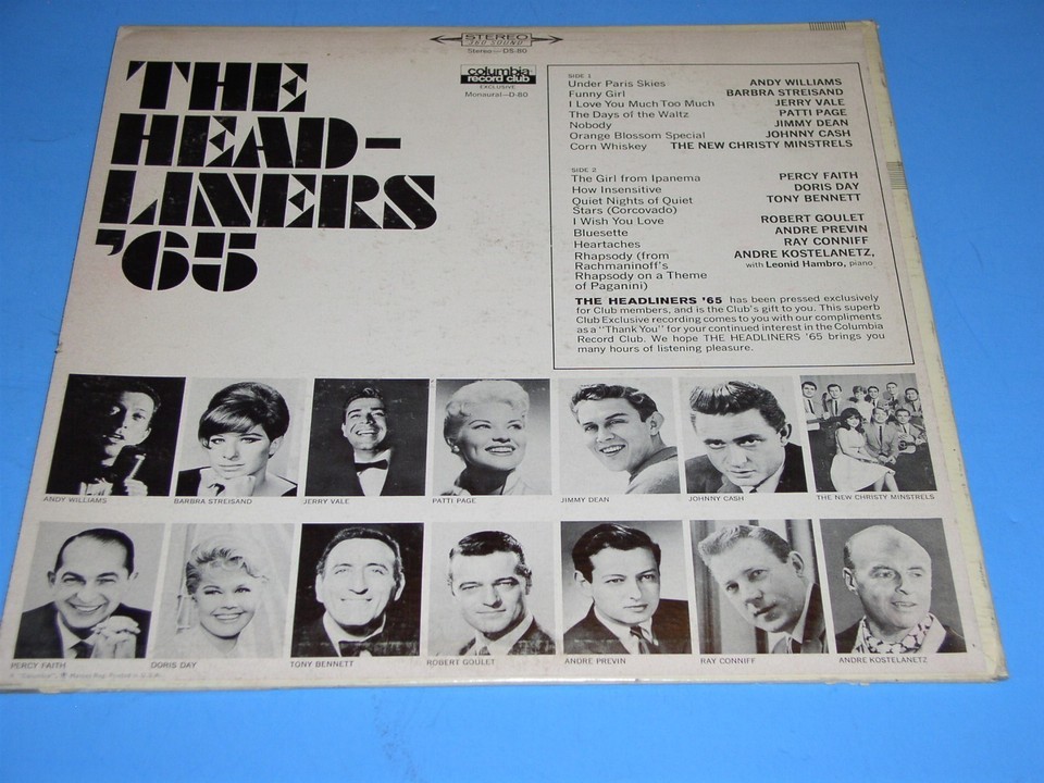 This is a vintage phonograph record album entitled, "The Head-Liners '65". Record label: Columbia Record Club DS-80 (Stereo). Songs by: Andy Williams, Barbra Streisand, Jerry Vale, Patti Page, Jimmy Dean, Johnny Cash, The New Christy Minstrels, Percy Faith, Doris Day, Tony Bennett, Robert Goulet, Andre Previn, Ray Conniff, Andre Kostelanetz. Record comes in its original plastic inner sleeve.