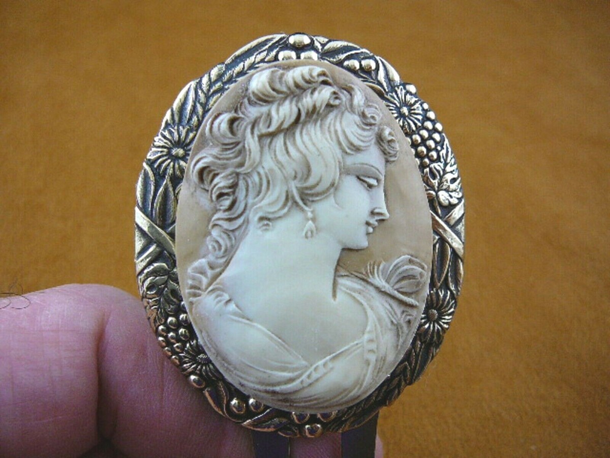 Mounted on a -duction brass hair pin; item is 5" long x 2" wide. Intended to be inserted in hair already up, as a beautiful adornment to your hair, the looks is similar to a tiara adornment. They can also be displayed as a new heirloom. Here is what the full hair pin looks like, it is a brass double prong 3-7/8" long, plus the added height of the pine resin cameo on a brass backing. Stunning.