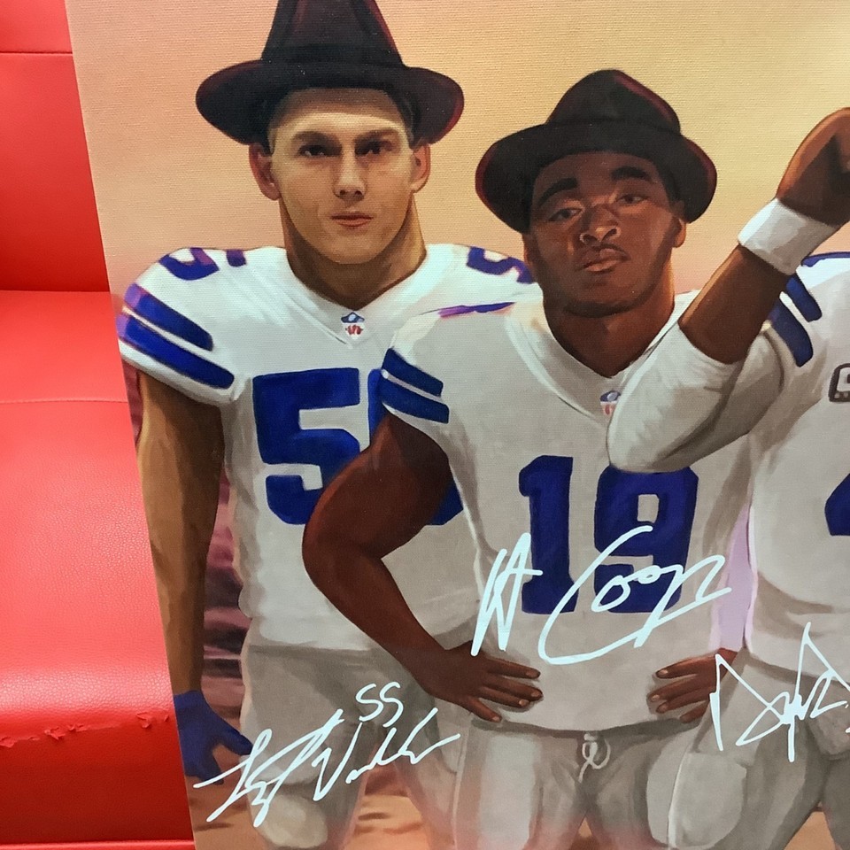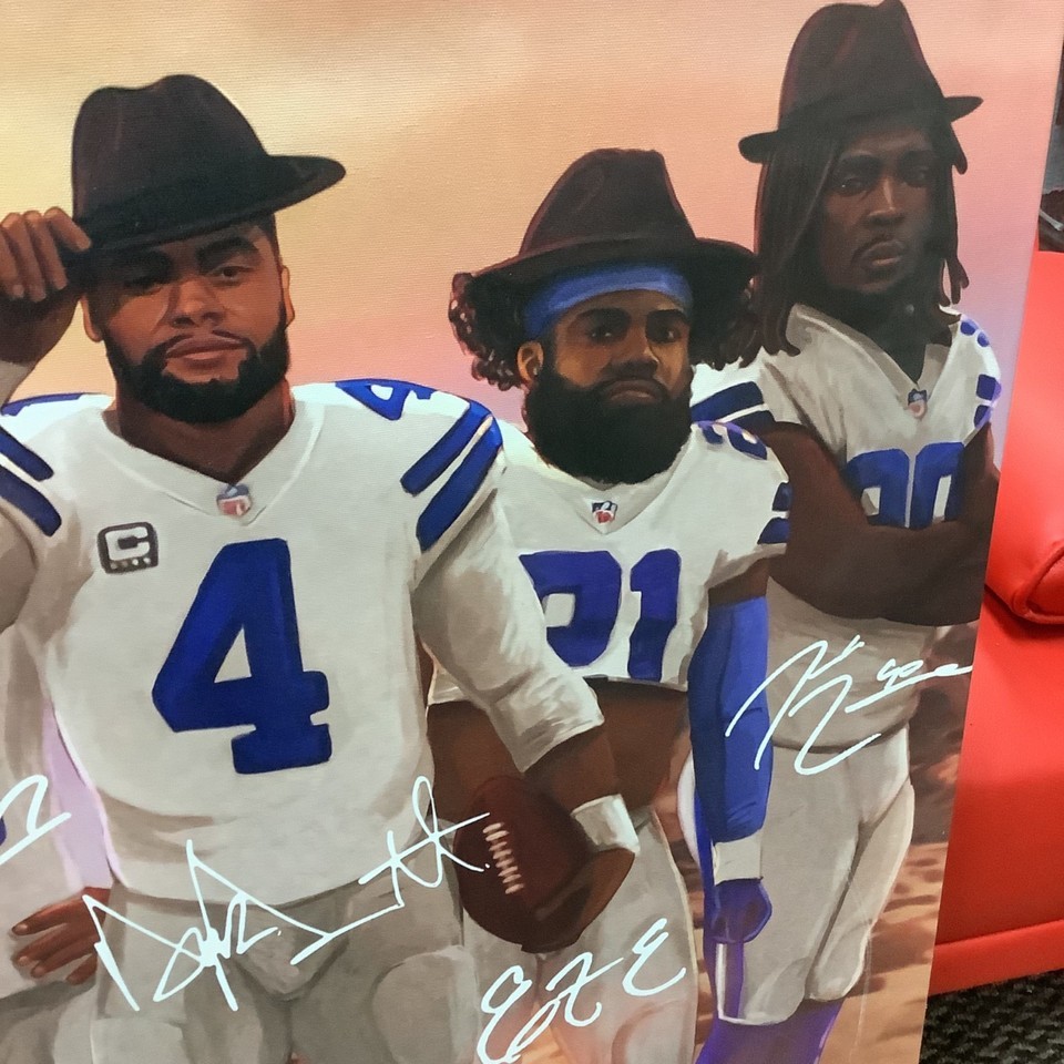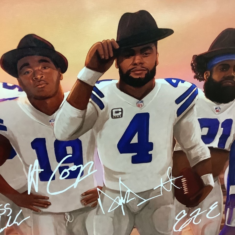 Large Dak Prescott Ezekiel Elliott ++ Dallas Cowboys QB NFL Poster Canvas 24x30?. Really nice condition. This is a canvas print of what looks like a western style painting, featuring Dallas Cowboy players, Dak Prescott, Ezekiel Elliott, Leighton Vander Esch, Amari Cooper and perhaps CeeDee Lamb but I?m unsure on that one due to the signature. Please see all photos.