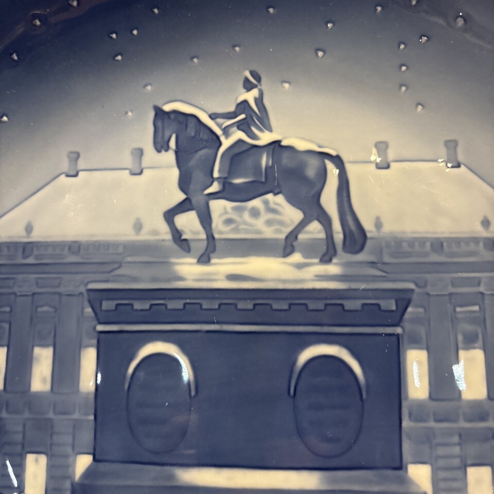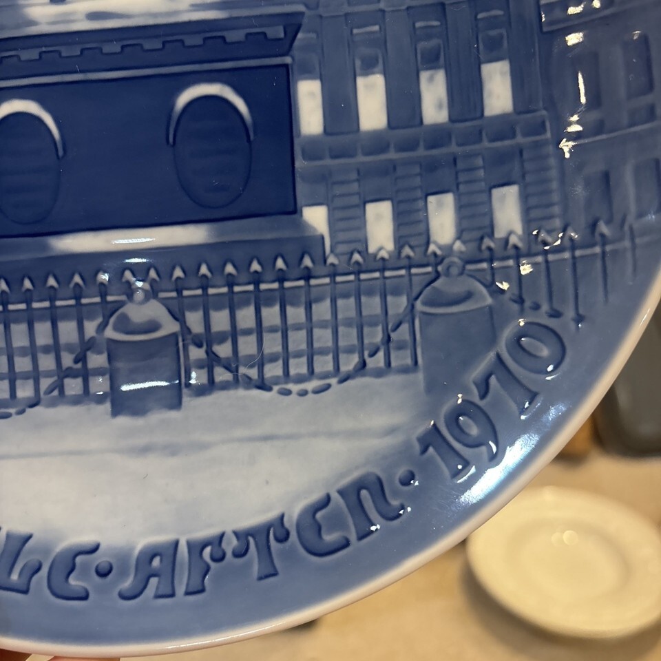 The Bing Grondahl 1970 Christmas Jubilee 9? Plate featuring Amalienborg Castle Palace is a vintage collector plate made of bone china. With a round shape and a diameter of 9 inches, this blue and white plate is a nostalgic piece from the late 20th century, representing the Christmas Jubilee theme. Very good condition