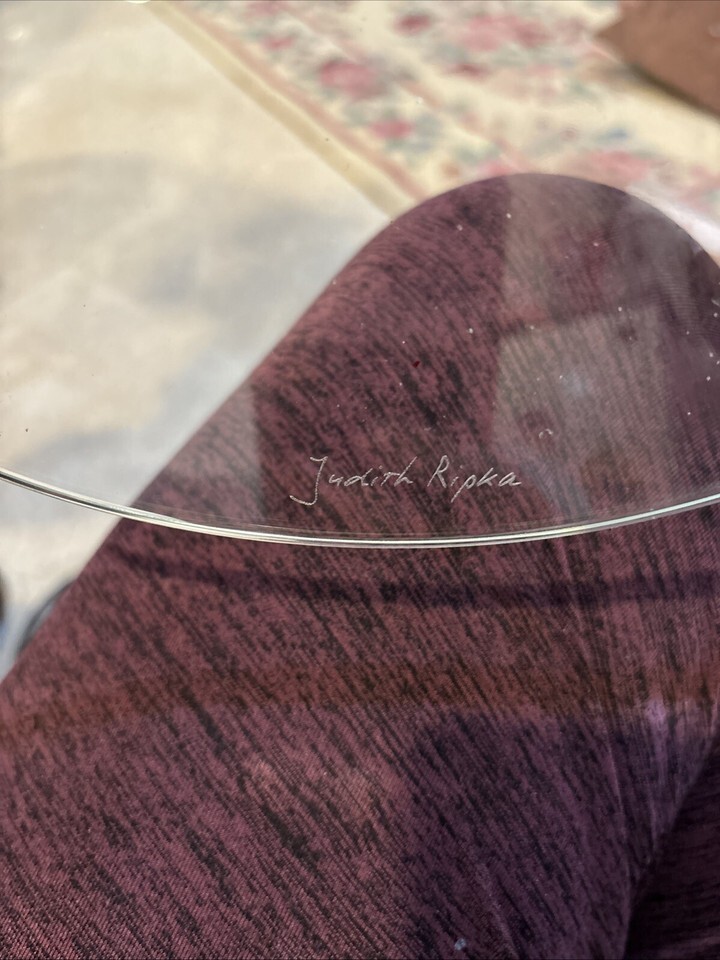 Small chip on edge. Hard to see. This is a Judith Ripka 13-inch cake plate stand adorned with Swarovski Crystals. The plate is made of clear crystal designed with red poinsettias and is signed by Judith Ripka. This elegant plate is perfect for displaying cakes and other desserts in a stylish and luxurious manner. Small chip on edge. Little wear on red. See pic