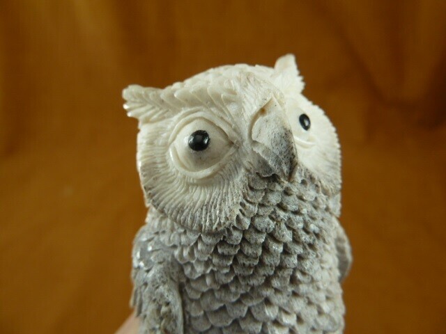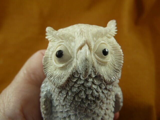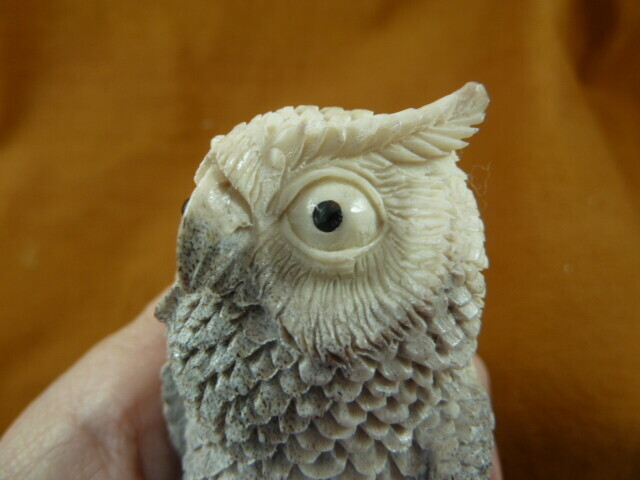 (OWL-W19) white gray Horned Owl shed ANTLER figurine Bali detailed carving owlet