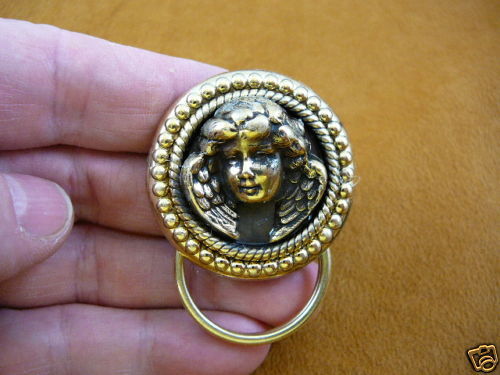 (Internal #E473) This is a Cupid Angel with wings piece of brass, on two pieces round of repro brass, made into a pin/pendant brass eyeglass or ID badge holder, 2-1/8" long x 1-5/8" wide (includes loop). Clasp pin/pendant glued on back horizontally. Excellent detail and texture on the brass.