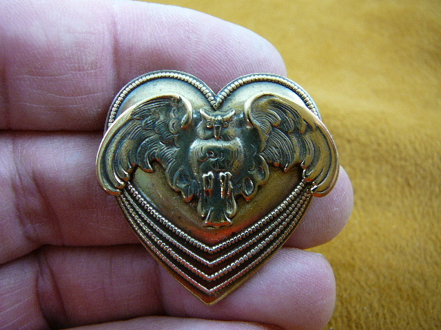 (Internal #B-BIRD-453) This is a beautiful owl with wings spread pin (glued on the back) made of - repro brass on a second piece of heart shaped brass, 1-7/16" long x 1-3/8" wide. This gorgeous - - stamped brass is antiqued, then buffed to create some shine. ?BRASS IS A GOLD COLOR?.