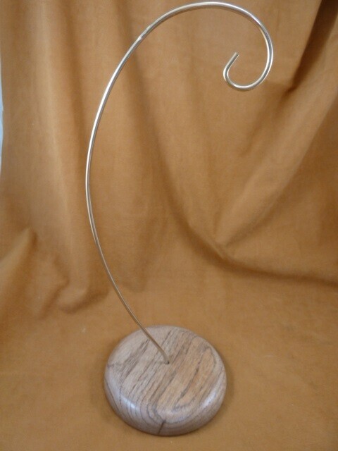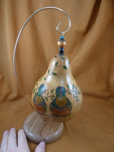 Hanging gourd with four colorful birds in green, yellow and orange with leaf accent design around; three wood beads on top with gold curly wire hanger; brass stand with oak base (included), made by Bruce