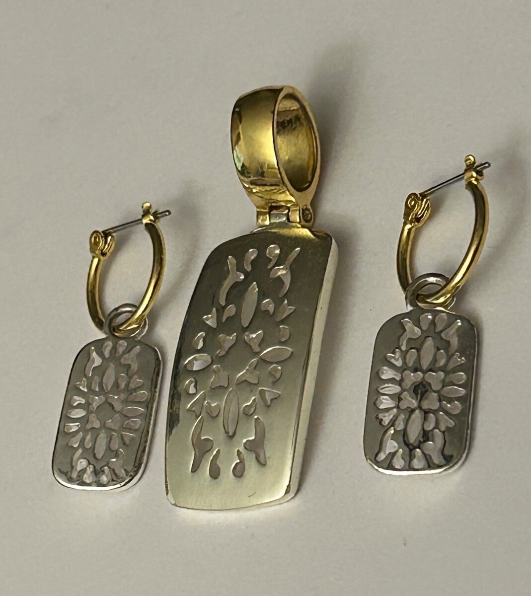 Gold & Silver Tone Pendant & Earrings Set By Premier Designs w/ Cutout Detailing