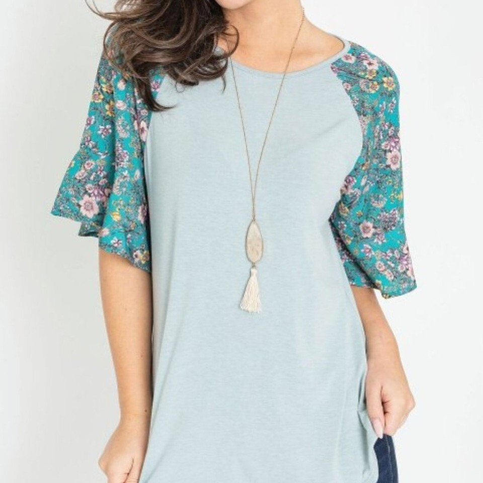 Mint Teal Ditsy Floral Raglan Ruffle Sleeve Tunic