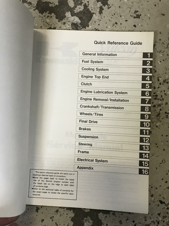 step by step instructions, assembly/disassembly, exploded illustrations/diagrams/troubleshooting, great manual to have when owning a VULCAN and will keep your VULCAN on the road. This manual will save you money in repairs/service.
