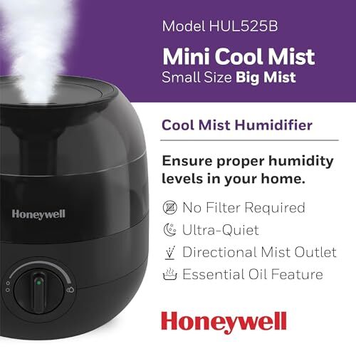 Bullet point: COOL MIST HUMIDIFIER ? Honeywell Mini Cool Mist Humidifier (HUL525B) helps ensure proper humidity levels in small rooms and personal spaces. Indoor humidity levels between 40-60% can help relieve cough/congestion, keep throat/nasal passages hydrated more.
