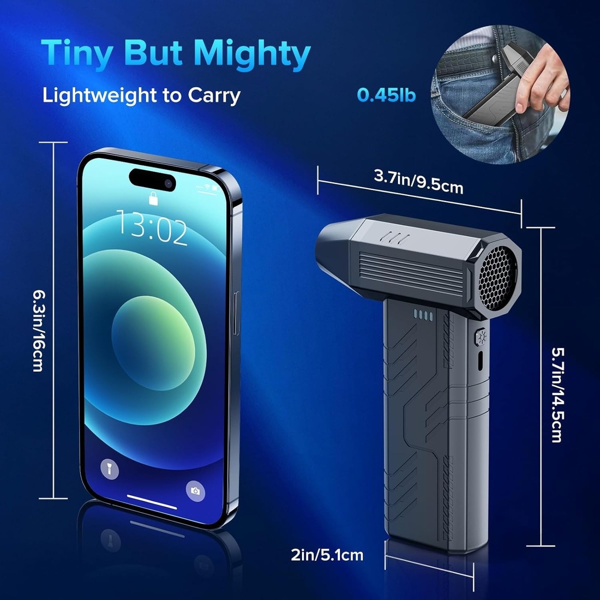 Advanced Brushless Motor Design: Experience powerful performance with a maximum speed of 130,000 RPM. The stepless adjustable airflow settings wind speeds of up to 55 m/s, equivalent to a category 4 hurricane.