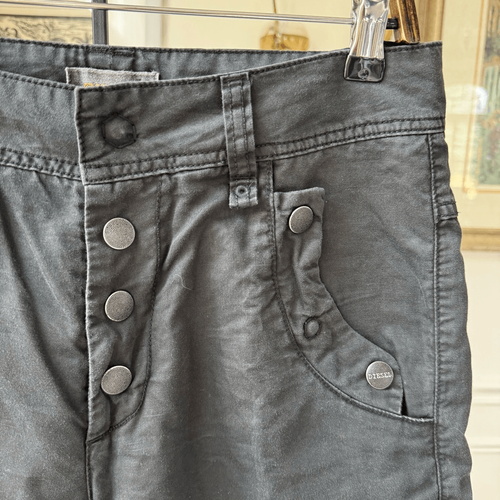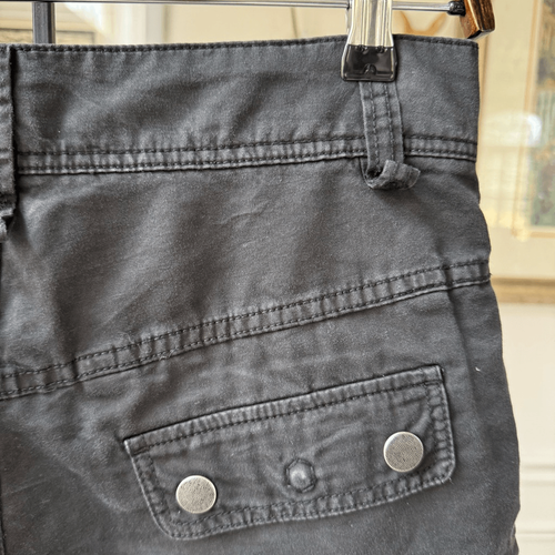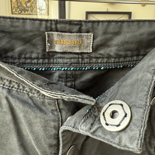 Vintage Y2K diesel industry washed black shorts with rivet and snap detail, some logo. The fly is snap closure, and the pockets at the hip also snap closed. Back flap pockets. Tag size 28. ? laying flat measures 15 inches straight across the waist with a 10.5 inch rise and a 7.5 inch inseam. $198 retail. Cotton, linen and viscose blend.