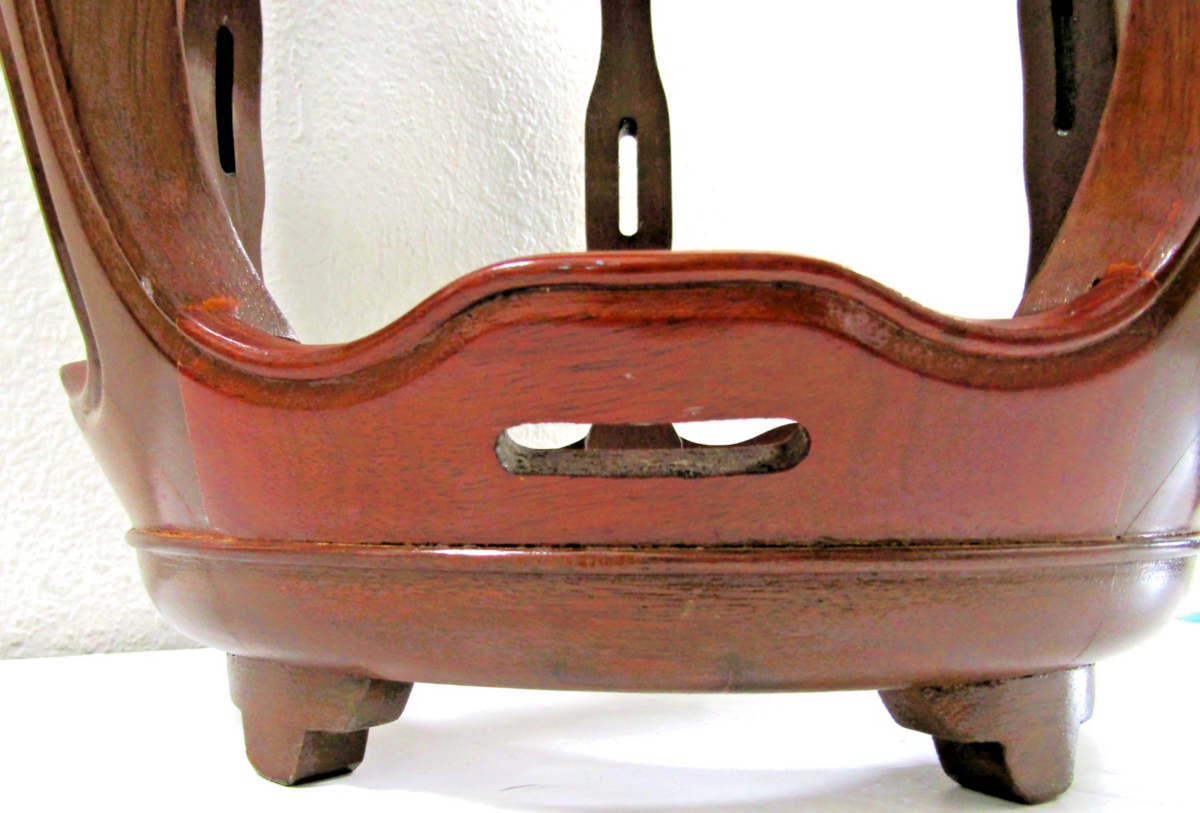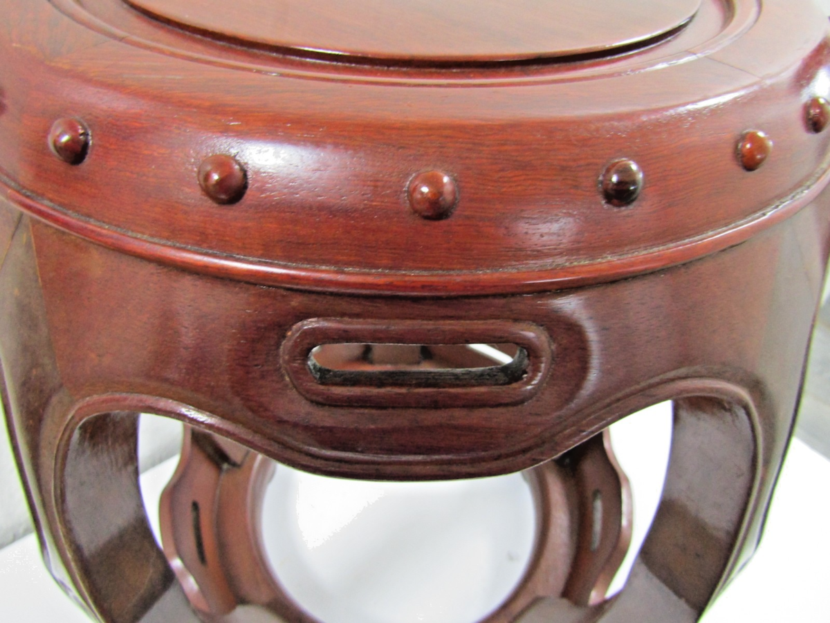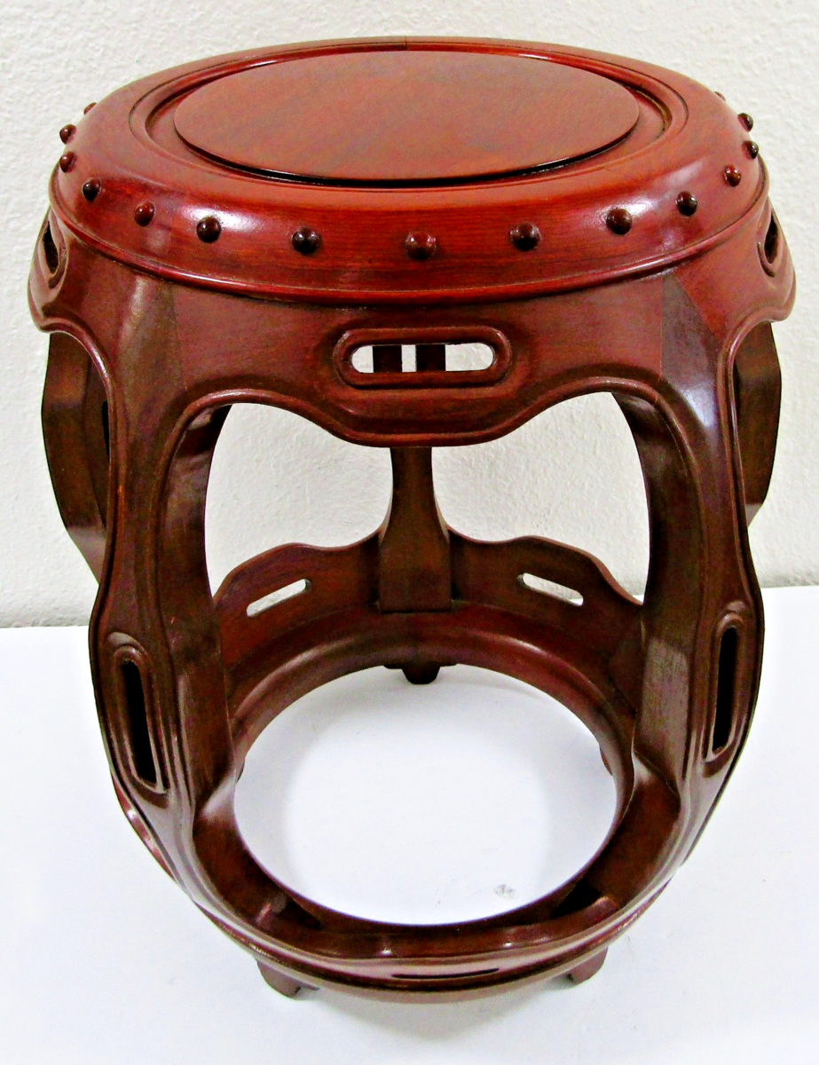 This Vintage Rosewood Hollywood Regency Barrel Stool Drum Plant Stand is a fully assembled antique piece with a classic brown color and intricate carvings. Crafted from rosewood with a Hollywood Regency style, this unique item serves as a functional piece of furniture suitable for any room. Standing at 18 inches tall and with a tabletop diameter of 16 inches, this original post-1950 vintage piece is a stylish addition to any indoor space looking for a touch of elegance and sophistication.