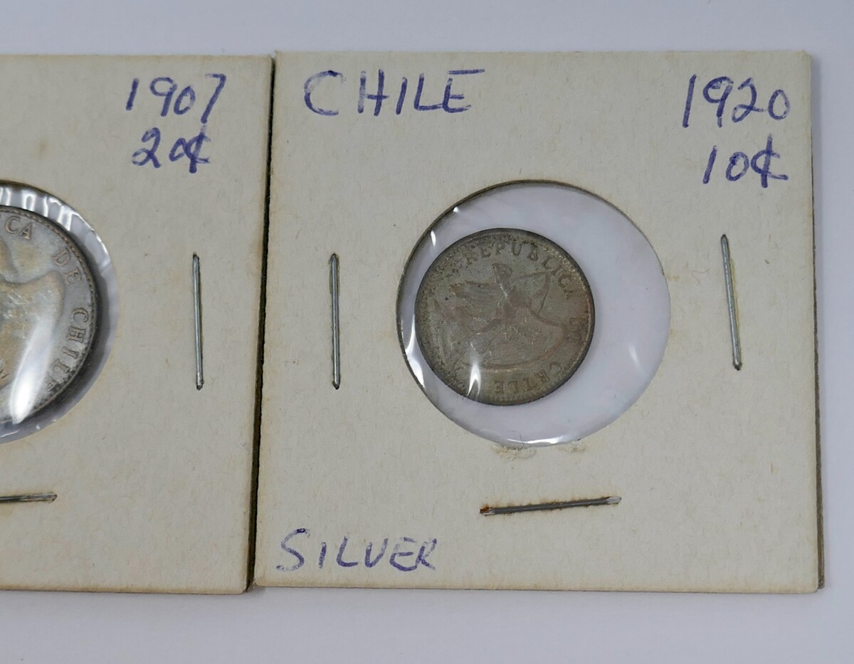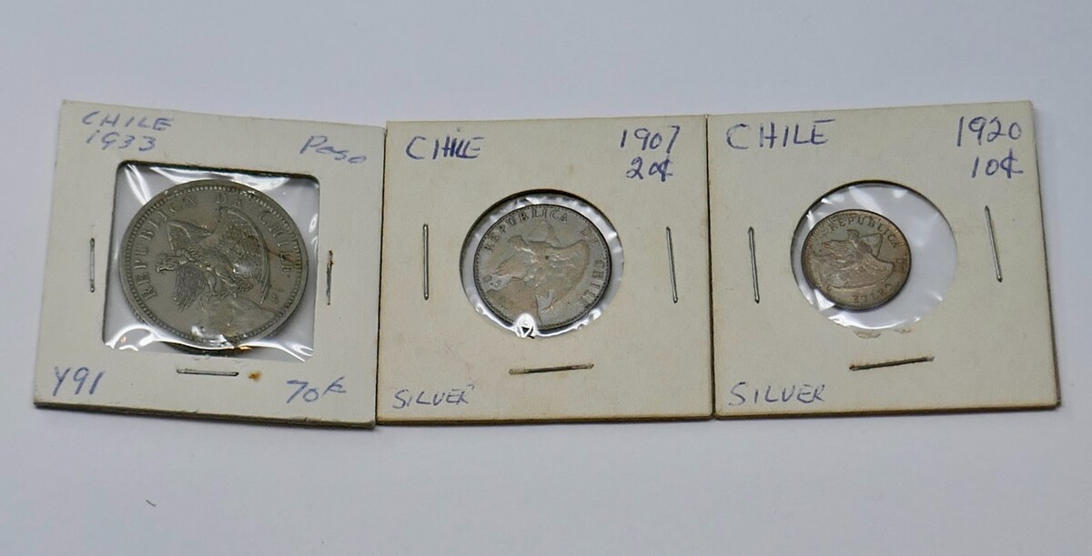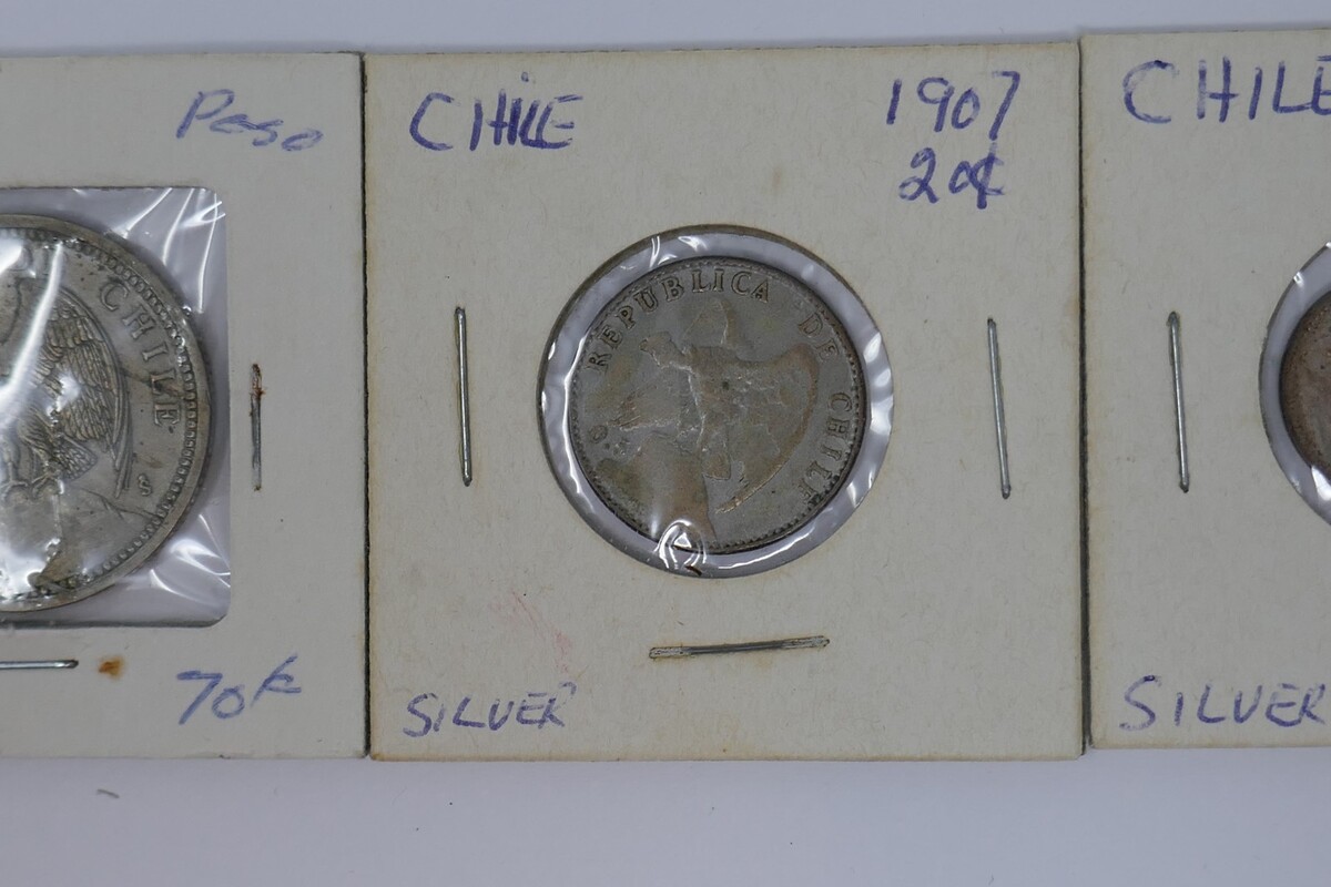 This is a lot of 3 Chile Coins. Included is a 1907 Twenty Cents 20 Centavos Silver Coin,