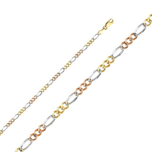 This exquisite Figaro chain is meticulously crafted from genuine 14-karat tri-tone gold, combining yellow, rose, and white gold to create a stunning piece of jewelry. The design features a distinctive arrangement of three round links followed by one elongated link, offering a classic yet contemporary look. Each of the links boasts a concave design, which not only enhances the chain?s aesthetic appeal but also ensures smooth and comfortable wear against the skin.