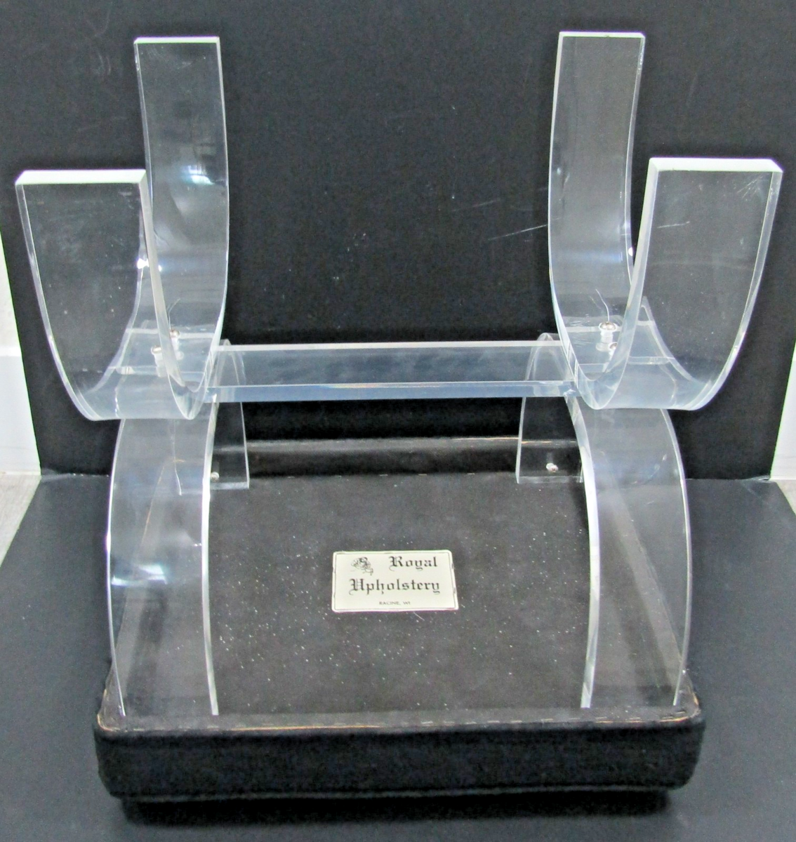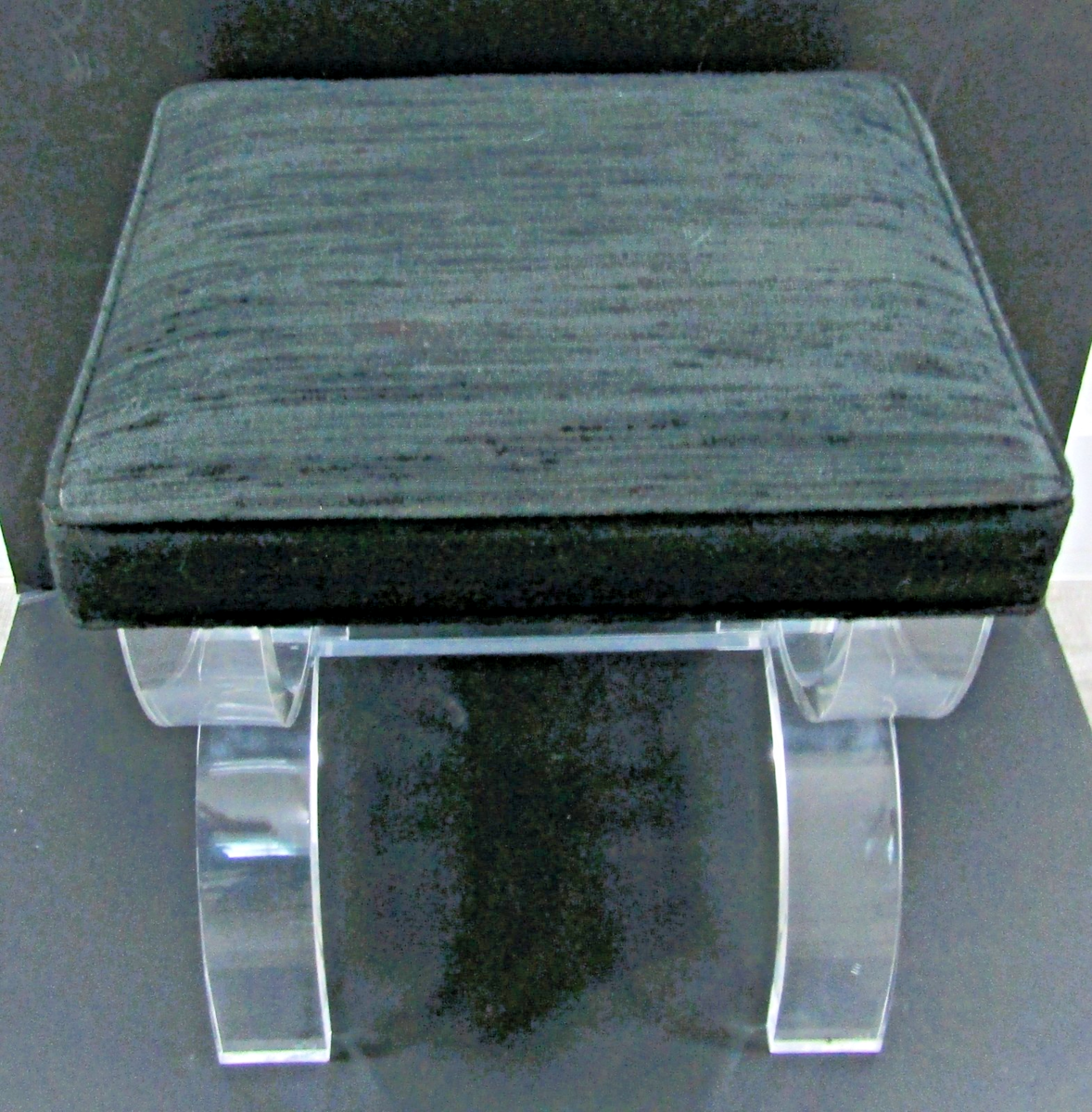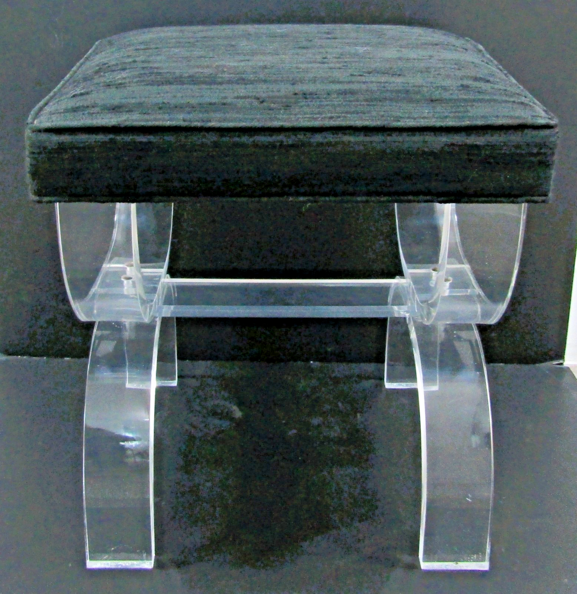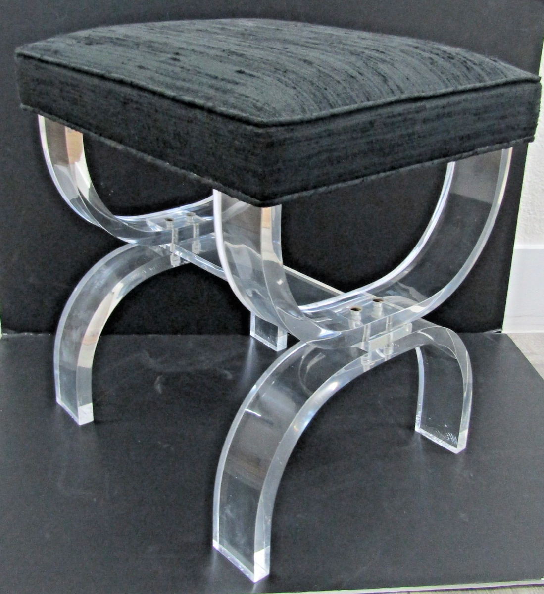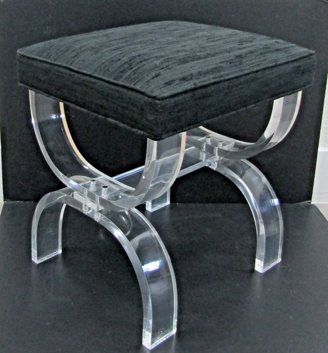 Vintage Lucite and Black Upholstery Thick Curved Legs X-Style Vanity Stool