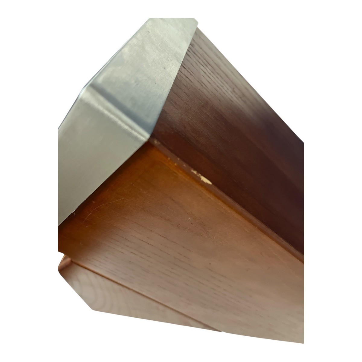 Medium brown wood, silver tone metal