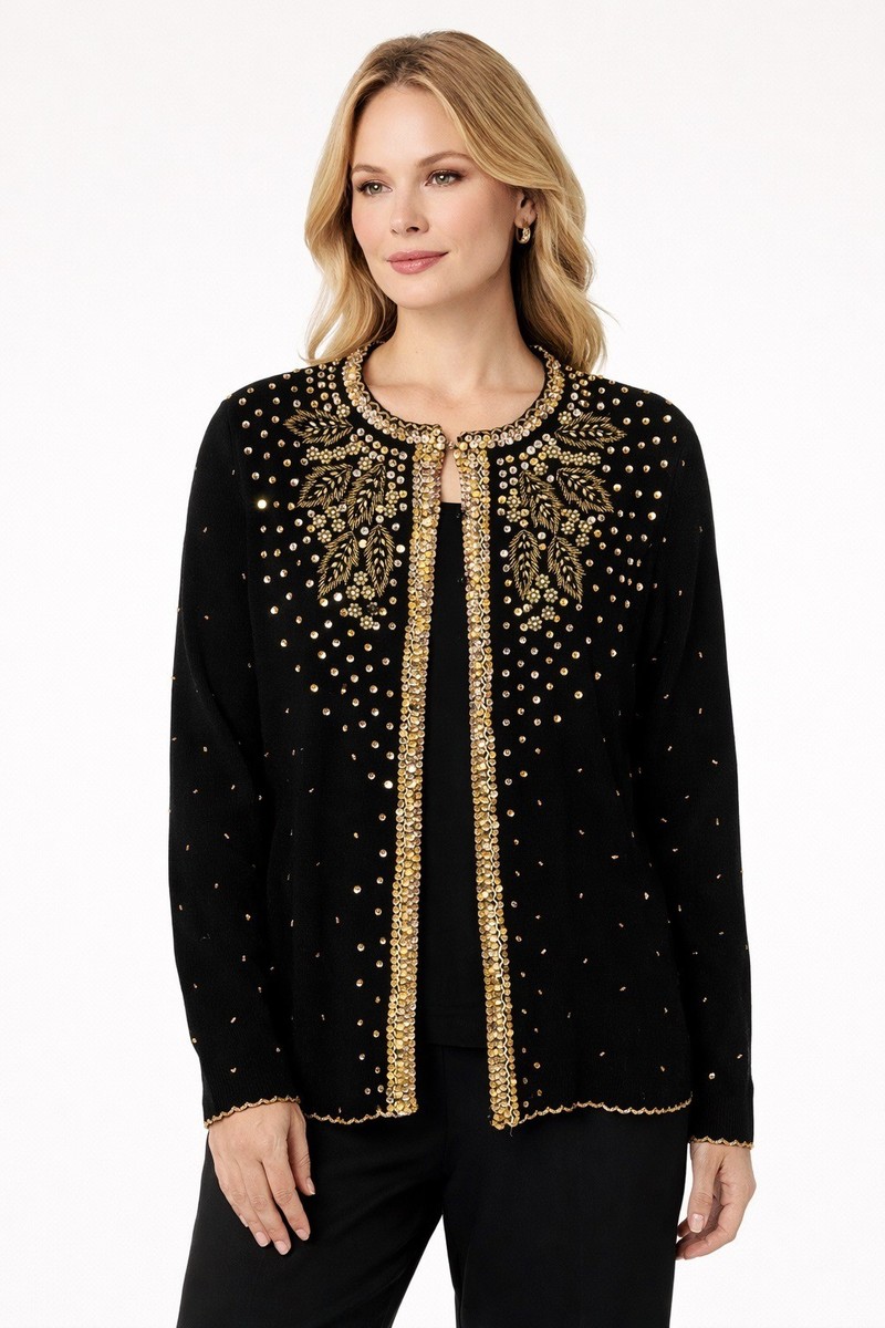 Nu Chic black lambswool cardigan sweater featuring ornate gold bead and sequin embellishment throughout. This piece has an open front design with a heavily beaded neckline and front trim, plus detailed leaf and dot motifs across the front and shoulders. Fully lined interior. Elegant, statement-style sweater suitable for evening wear, special occasions, or dressy layering.