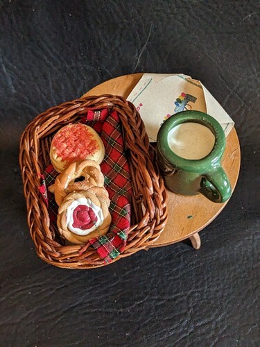 Up for sale is a used 2009 Byers Choice Round Side Table With Sweets Gingerbread Santa Mug Letter.