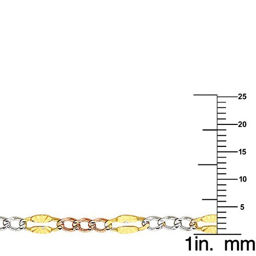 This exquisite Figaro chain is meticulously crafted from 14-karat tri-tone gold, showcasing a harmonious blend of colors with three white gold round links alternating with three rose gold round links. Each section of these round links is gracefully interspersed with elongated oval links that have a diamond-cut stamp, adding a distinctive sparkle to the design. Measuring 3.7 mm in width, this chain embodies both elegance and durability, making it a standout piece in any jewelry collection.