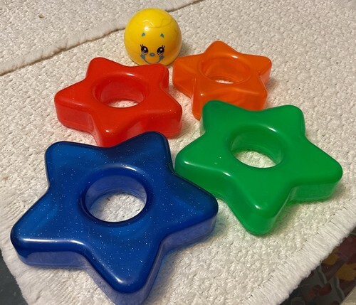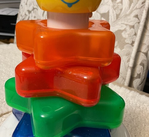 "Babies will love stacking the sparkling, star-shaped rings on the roly-poly base and watching lights 'twinkle' as three 'sparkling' sound effects play. Or when babies push own on the smiling face, they'll be delighted to hear five musical tunes play (three classical selections and two children's tunes) as lights dance to the music."