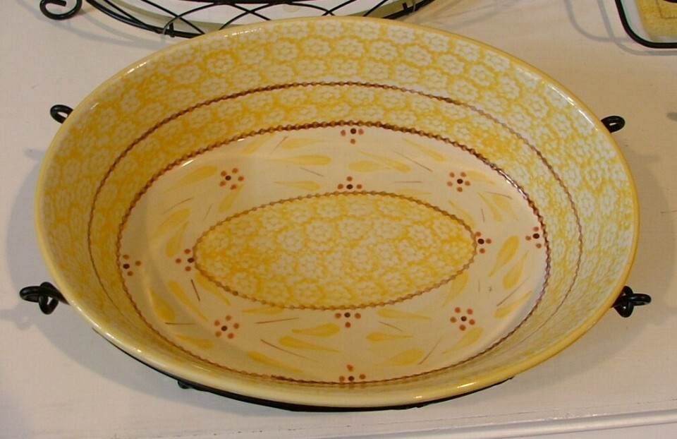 This is a Temp-Tations Presentable Ovenware 2 Quart Casserole Dish with Serving Rack, Trivet and Lid. Old World Yellow by Tara