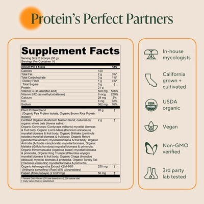 Expiration Date of 10/2026 ? PROTEIN + MUSHROOM POWER ? 16 servings per bag with 21g plant-based protein, BCAAs, and 2000 mg functional mushrooms to support energy, recovery, immunity, and focus. ? IMMUNE GUT HEALTH: Made with 10 powerful mushrooms -- lion?s mane, reishi, cordyceps, and turkey tail more to help keep your immune system strong and ready to defend year-round. Each serving delivers an efficacious 2000 mg of organic mushrooms and 400 mg of naturally occurring beta-glucans to help prime immune function, nourish gut health with prebiotic compounds to support digestion and gut health - helping you feel lighter, more energized, and nourished from the inside out. ? SUPPORTS STRESS RELIEF: Includes KSM-66 Ashwagandha, a clinically studied natural adaptogen that helps reduce daily stress and cortisol levels so you feel more balanced and focused. ? EASY TO USE VERSATILE ? Mix into coffee, smoothies, or recipes for a simple way to add wellness support to your routine. ? USA ORGANIC, NO FILLER: Made from 100% certified organic mycelial biomass cultured on organic oats? using both the mycelium and fruiting body so no part of the mushroom goes to waste and providing a full spectrum of active compounds? ? OM MUSHROOMS: We grow, dry, and mill our mushrooms in Southern California, ensuring every product is proudly USA grown the Om way. Our powders, capsules, beverage mixes, and gummies are USDA Certified Organic, Non-GMO, gluten free, vegan, paleo friendly, keto friendly, and kosher. Each batch is thoroughly third-party tested to confirm purity and potency.