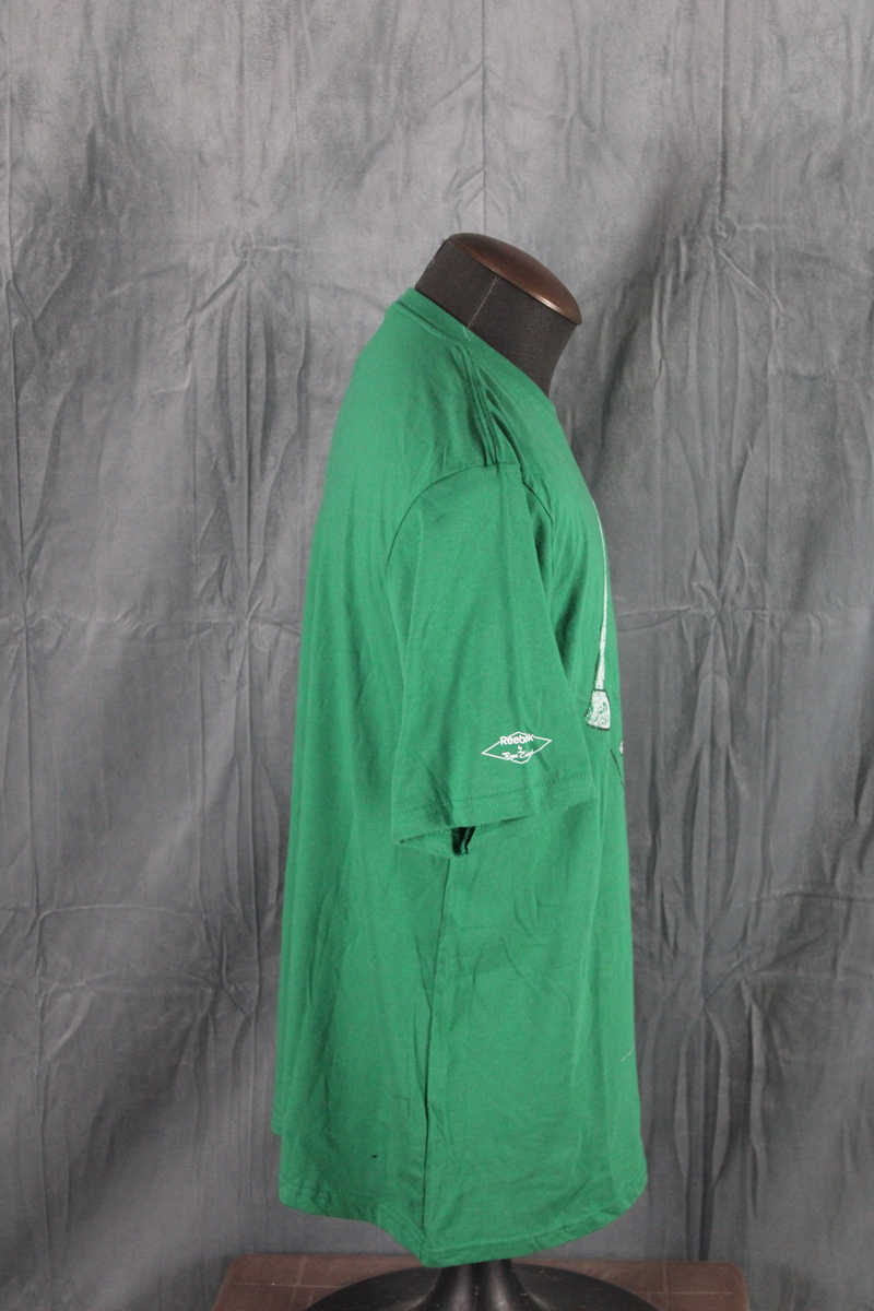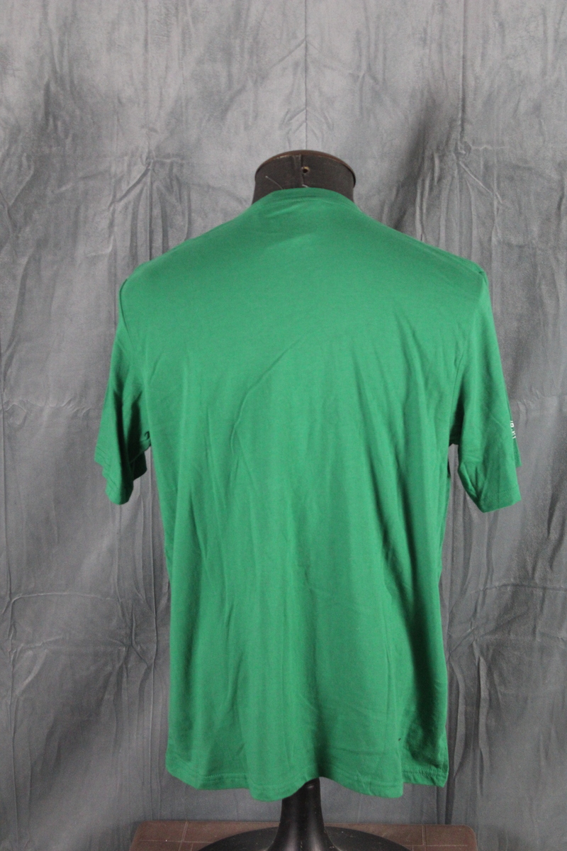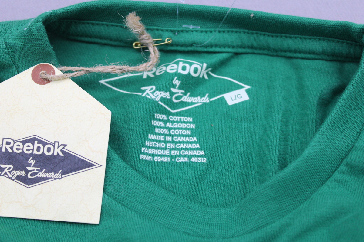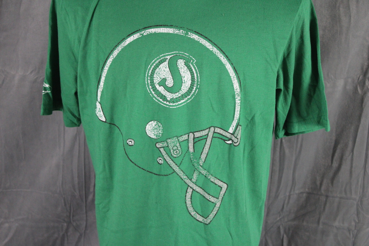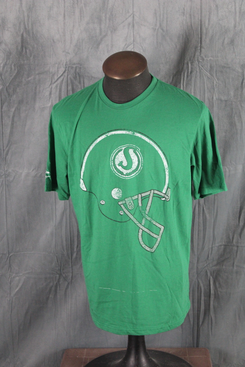 Up for sale is a retro Saskatchewan Roughriders shirt by Roger Edwards. It has a green base colour with a distressed graphic of a Roughrider helmet on the chest. What a great shirt do not miss out on it.