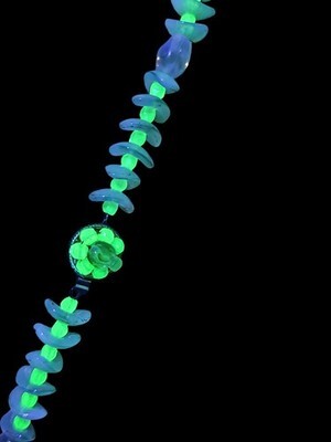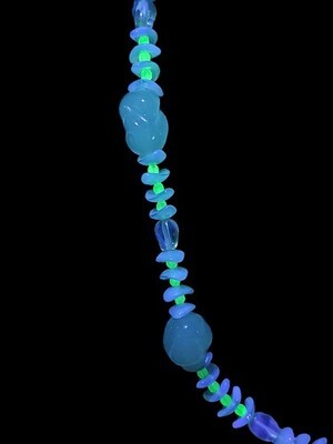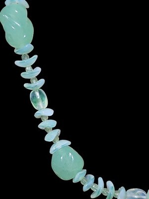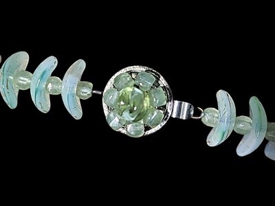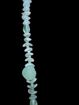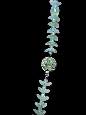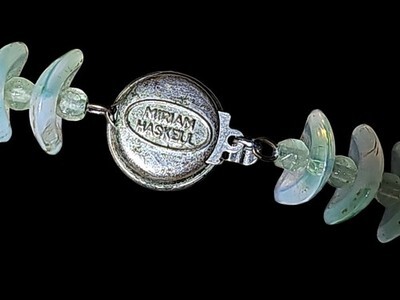 This piece displays the classic Haskell aesthetic ? rich color, dimensional beadwork, and elegant mid-century design. The glass beads catch the light beautifully, shifting from soft green to milky opal tones depending on angle and lighting.