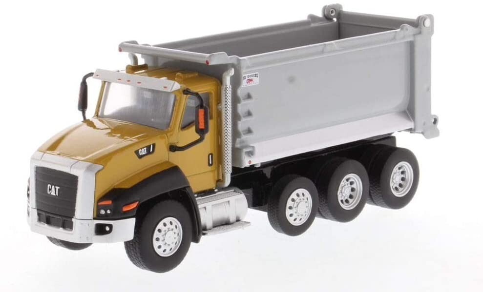 The CAT CT660 Day Cab Tractor with OX Stampede Dump Truck model measures about 6" long, the width is 1.75". It is made of diecast metal and plastic parts. The wheels are made of rubber and can roll freely.
