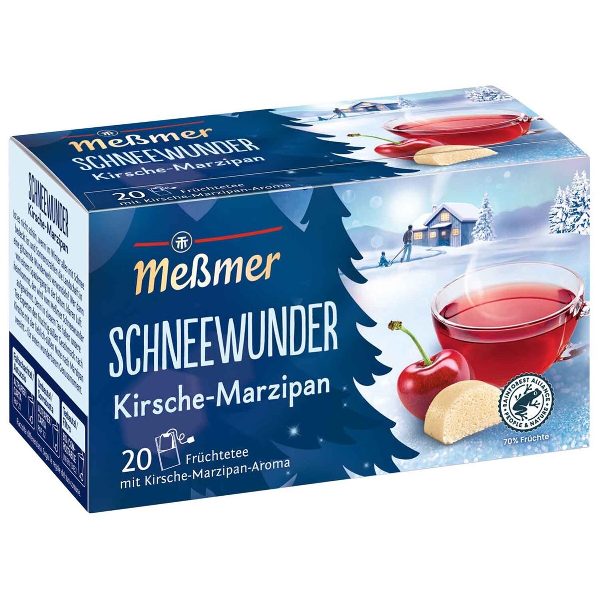 A winter delight. Meßmer Snow Wonder Cherry-Marzipan offers you sweet moments of comfort during the winter season. This delicious fruit-based tea has an intense flavor of juicy cherries, accompanied by a sweet marzipan note. A heartwarming taste experience that captivates all the senses.