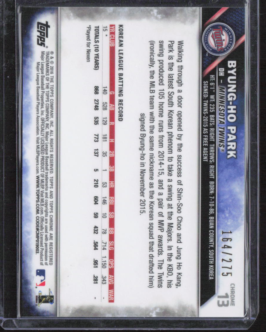 2016 Topps Chrome #13 Byung-Ho Park Purple Refractor #/275 RC