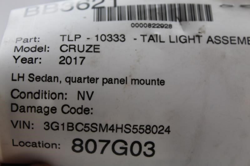 Left Driver Tail Light Quarter Panel Mounted 2017-19 CHEVROLET CRUZE OEM #12141